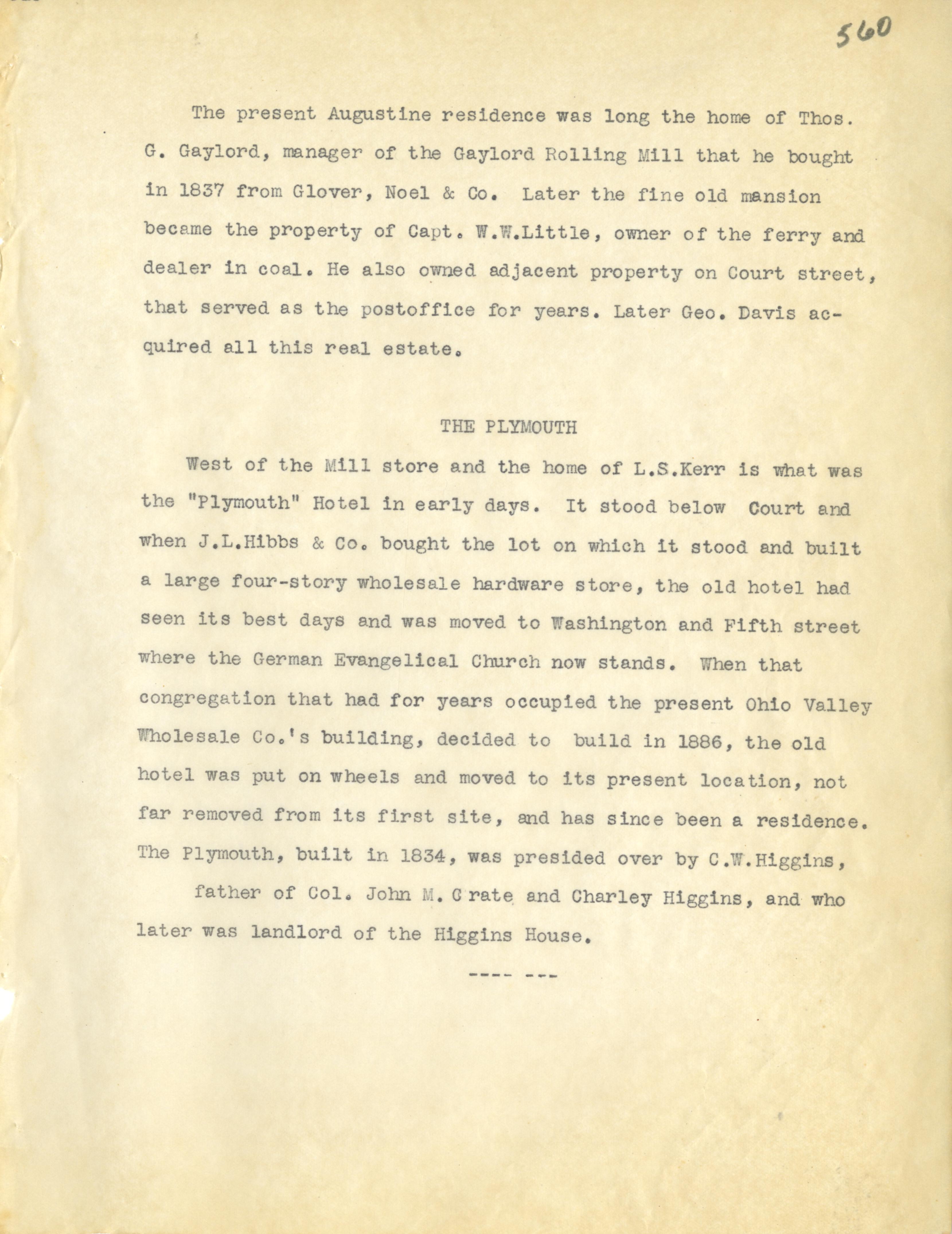 - Photo image of scanned scrapbook page. Pictured is a typed page with information about the people who lived in the Augustine Residence; The Plymouth Hotel was located on Court Street; Thomas Gaylord; Gaylord Rolling Mills; Glover, Noel & Co.; Captain W. W. Little; George Davis; Mill Store; wholesale hardware store; German Evangelical Church; Ohio Valley Wholesale Company, built in 1886; C. W. higgins; Col. John M. Crate; Charley Higgins; Higgins House