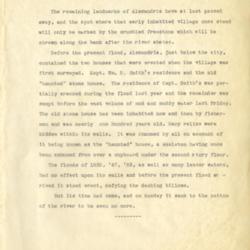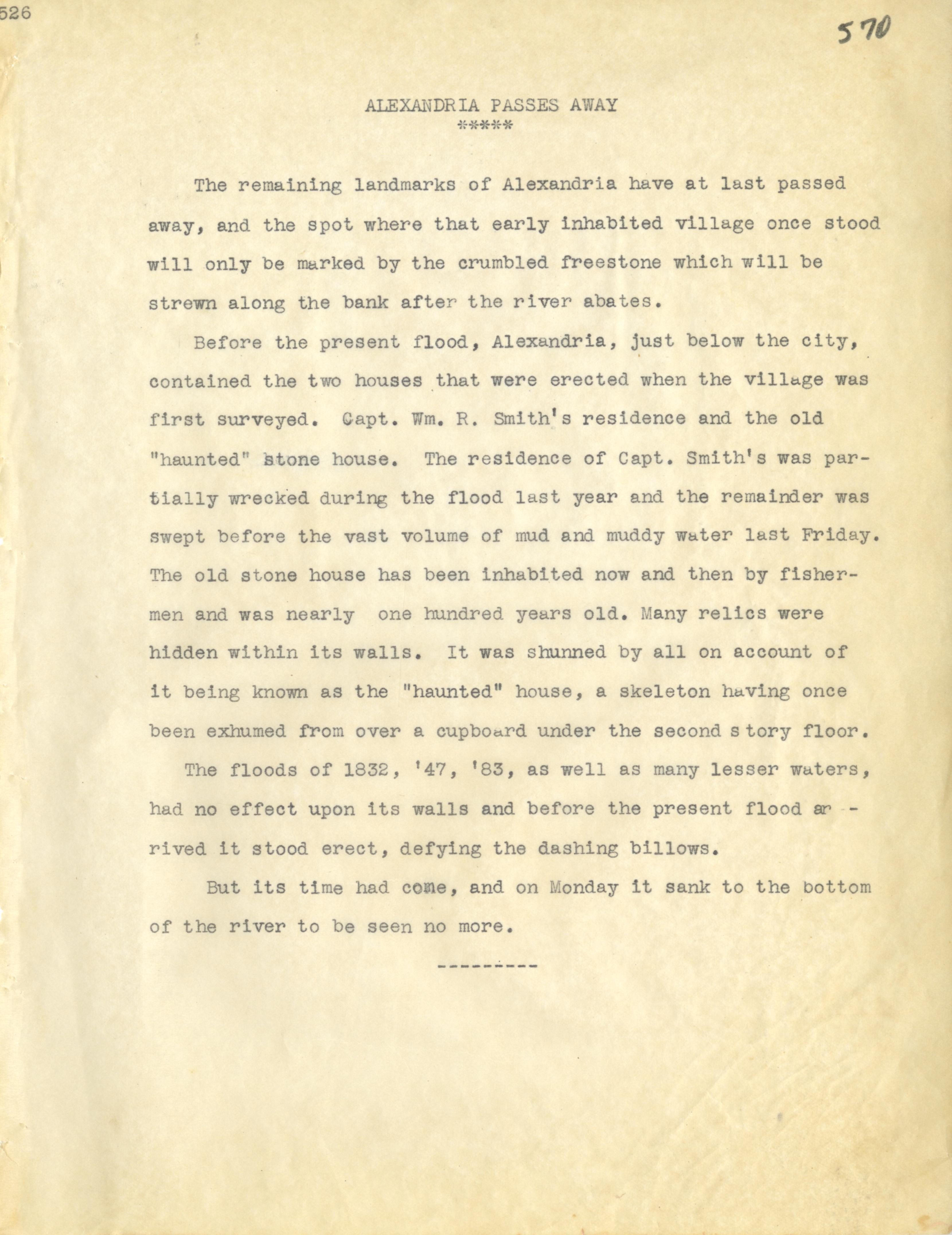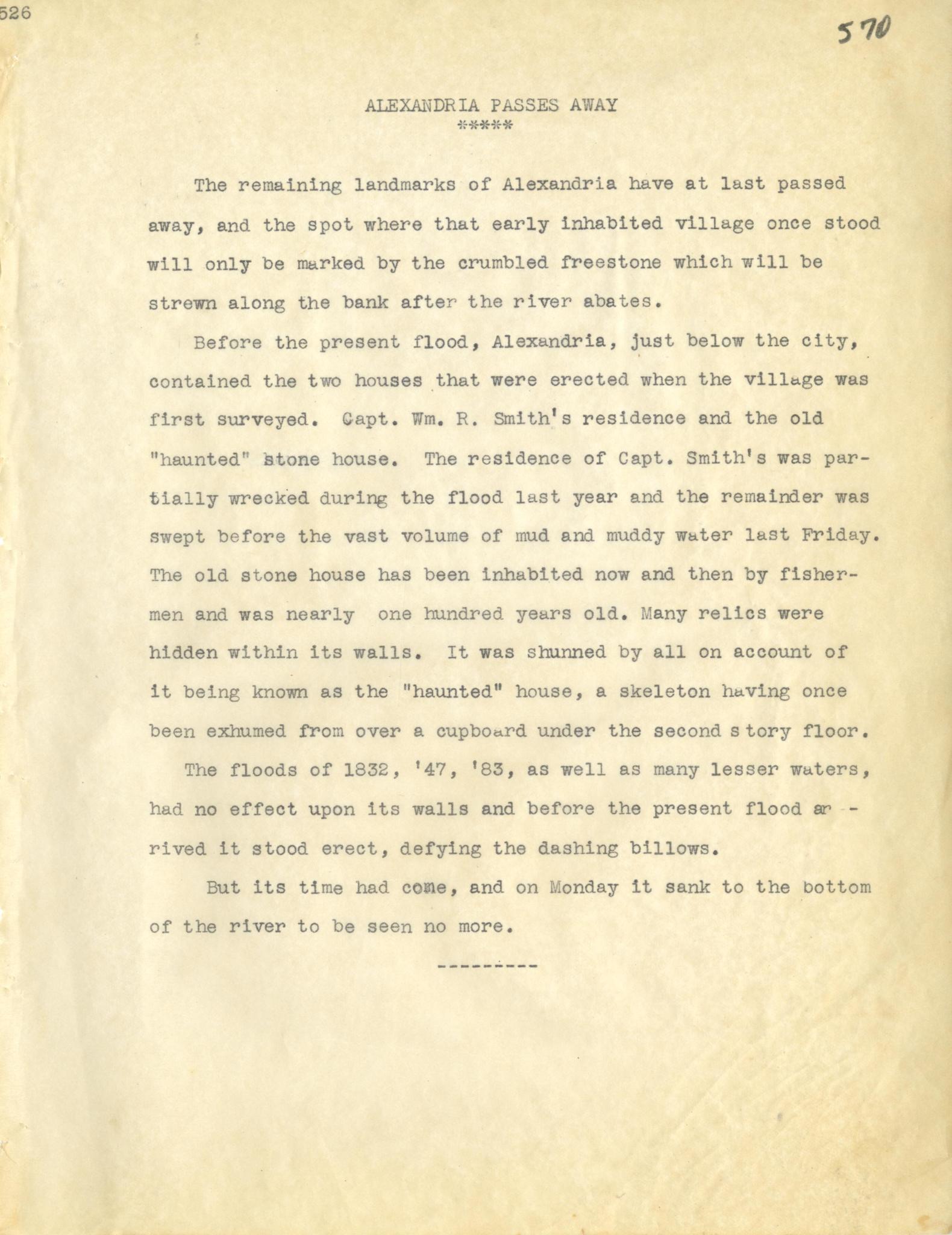- Photo image of scanned scrapbook page. Pictured: typed page entitled "Alexandria Passes Away." Article is about the few remaining landmarks of Alexandria. Floods; Captain William Smith's residence; Old Haunted Stone House