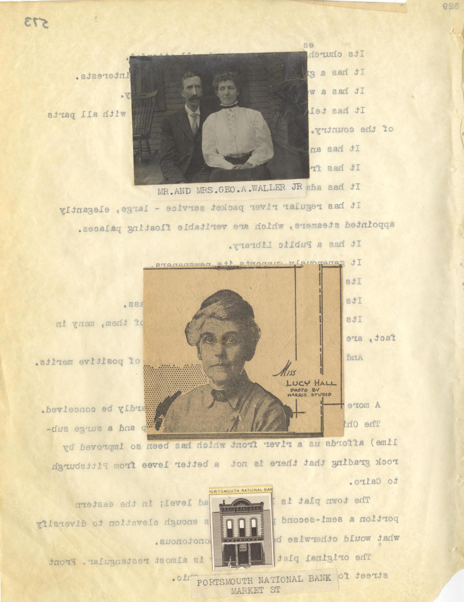- Photo image of scanned scrapbook page. Pictured: Mr. and Mrs. George A. Waller Jr.; Miss Lucy Hall; Portsmouth National Bank
