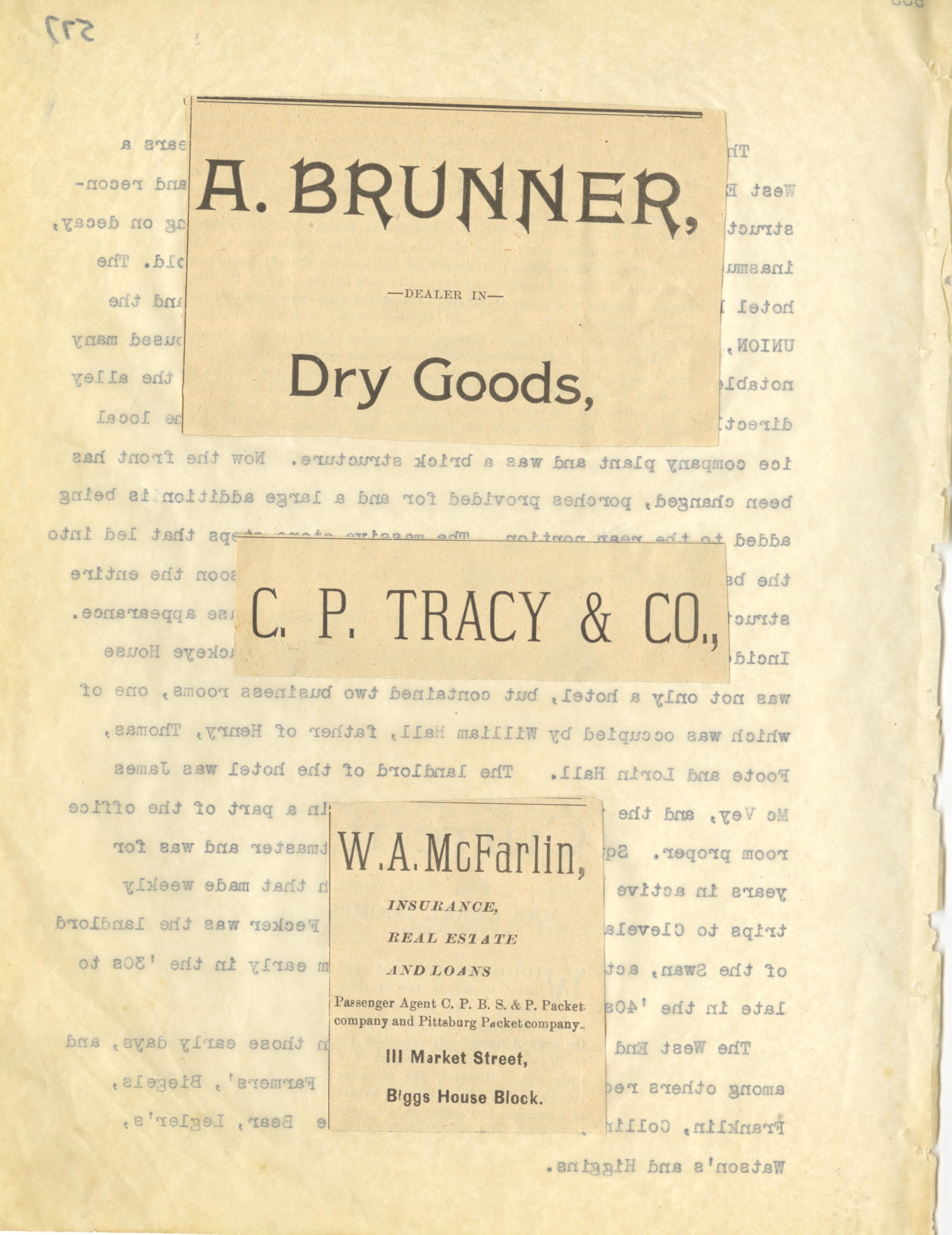 - Photo image of scanned scrapbook page. Pictured: A. Brunner, Drygoods Ad; C. P. Tracy Ad; W. A. McFarlin on Market Street