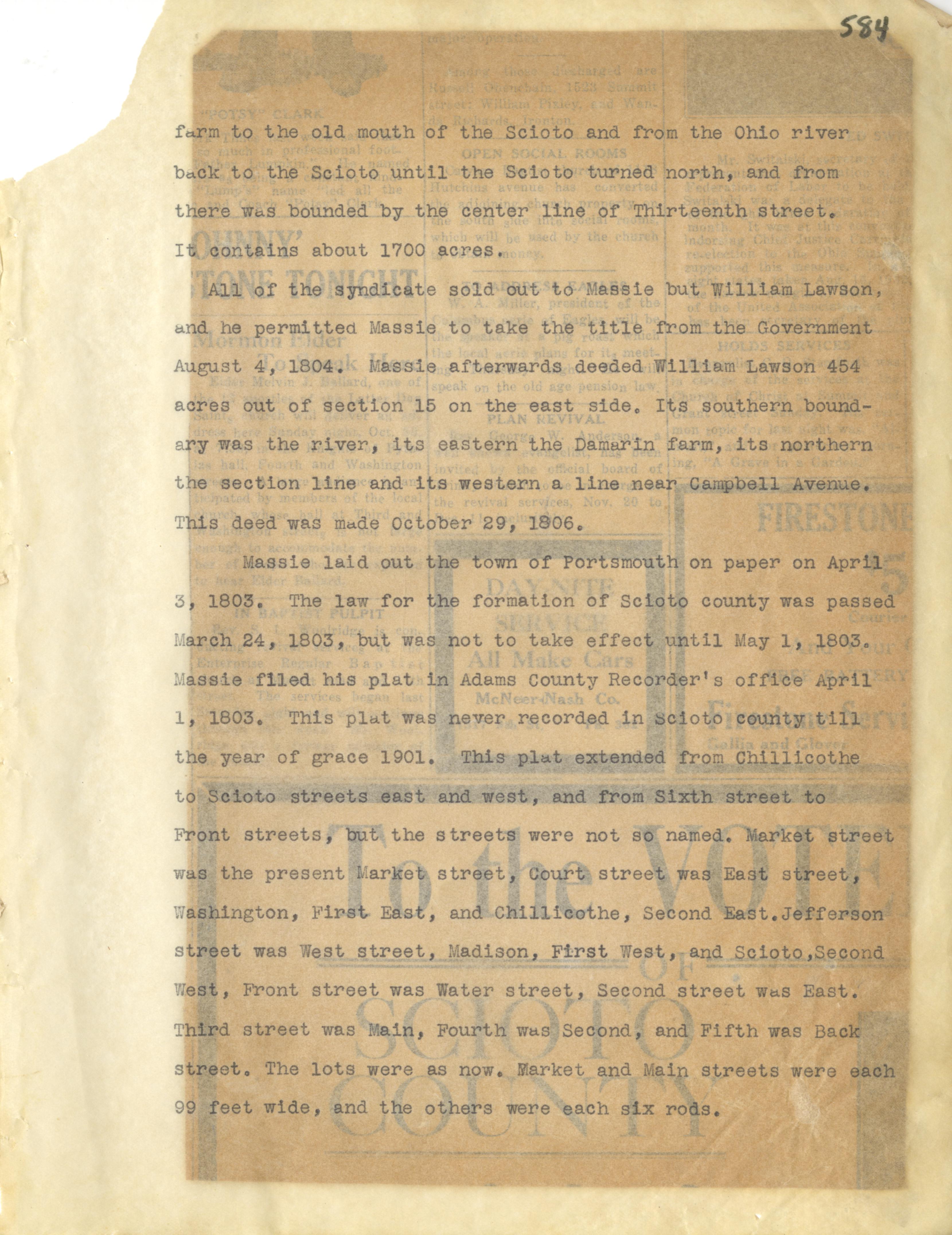 - Photo image of scanned scrapbook page. Pictured is a typed page about early Portsmouth history. It talks about how Portsmouth was platted and how Scioto County was formed from Adams County. Henry Massie; Ohio River; Scioto River; William Lawson; Damarin Farm; Campbell Avenue; Scioto County; Adams' County Recorder's Office; Chillicothe and Scioto Streets