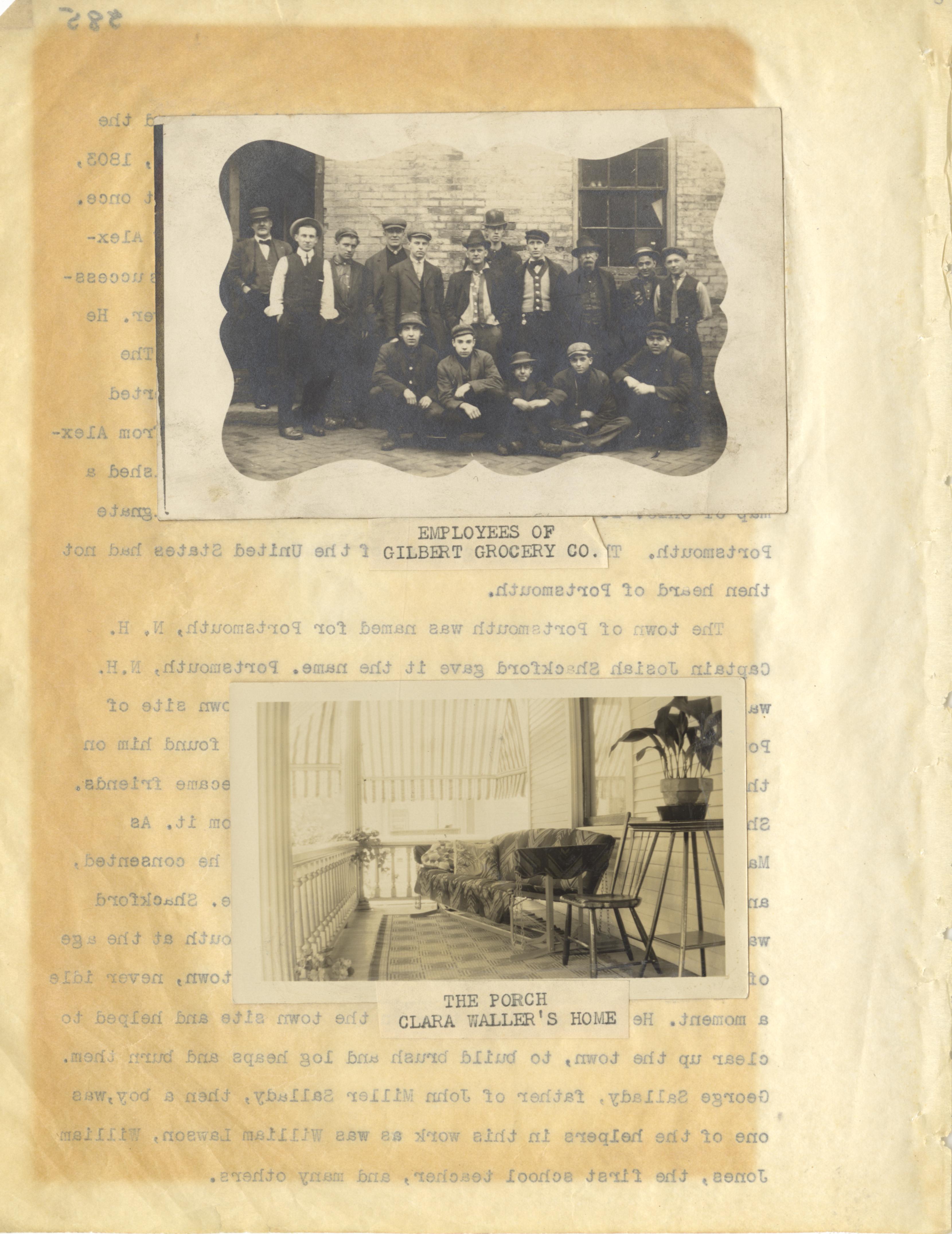 - Photo image of scanned scrapbook page. Pictured: Employees of Gilbert Grocery Company; The Porch of Clara Waller's Home