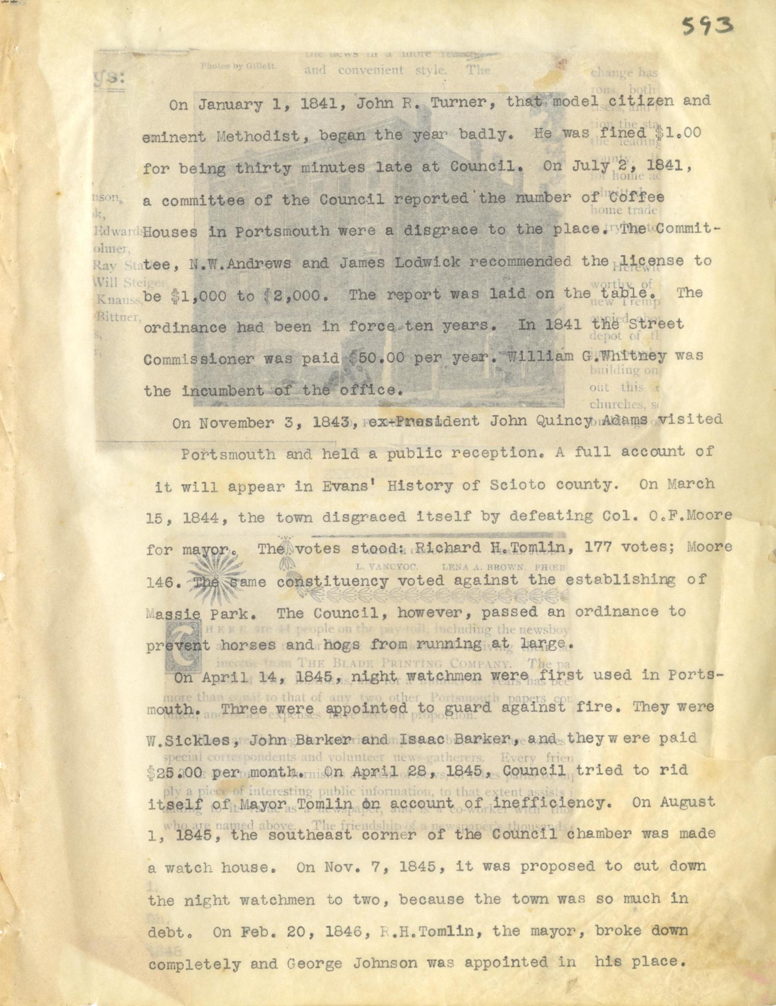 - Photo image of scanned scrapbook page. Pictured: typed page with general information about local residents. John R. Turner, local Methodist; coffee houses; James Lodwick; William G. Whitney; John Quincy Adams; Richard H. Tomlin; Col. O. F. Moore night watchmen; fire guards; City Council; mayor election