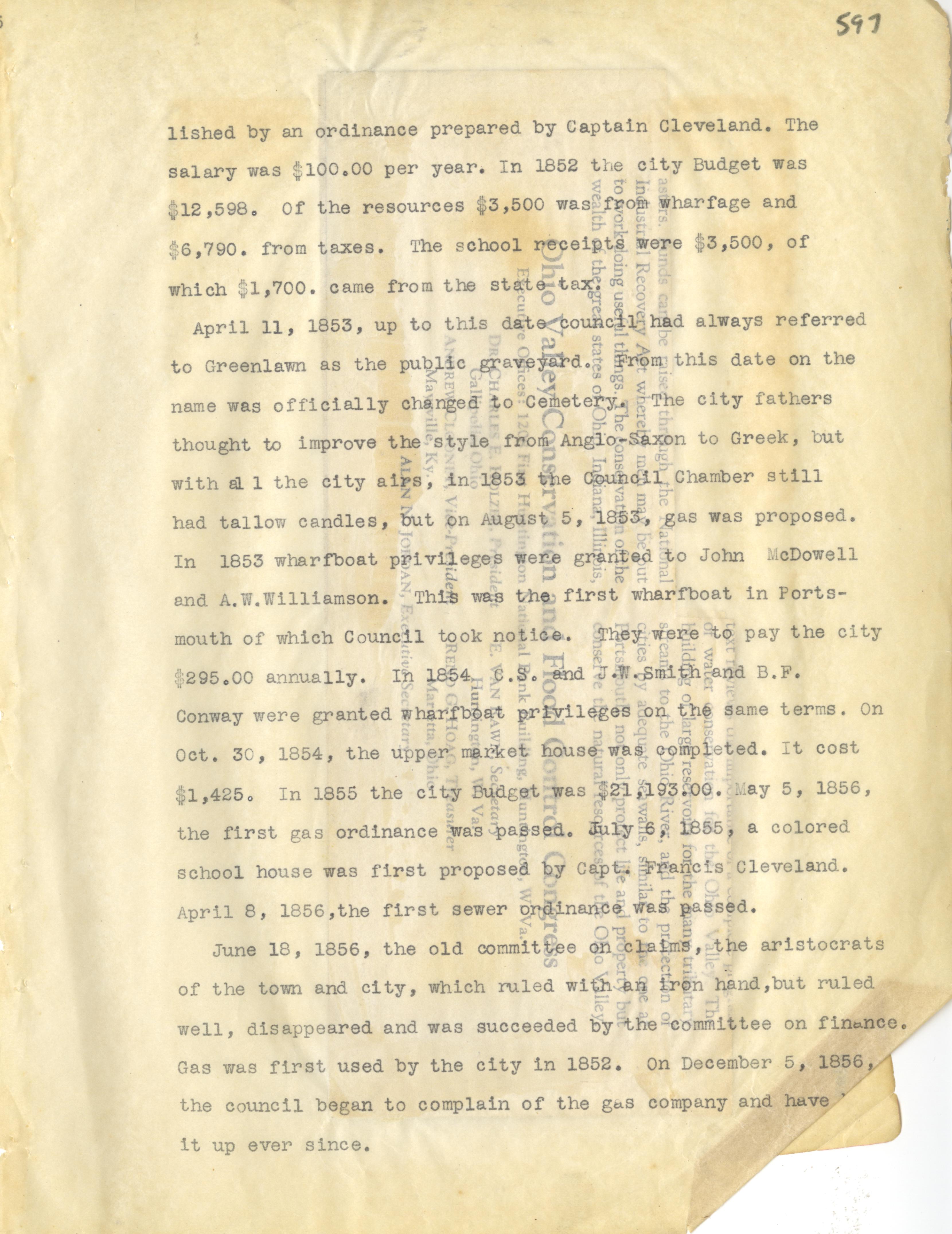 - Photo image of scanned scrapbook page. Pictured: typed page with information about the City Council City Upgrades and City Ordinances. Captain Cleveland; Greenlawn Cemetery; City Council; Council chamber; Wharf boats; John McDowell; A. W. Williamson; B. F. Conway; sewer; committee; gas company