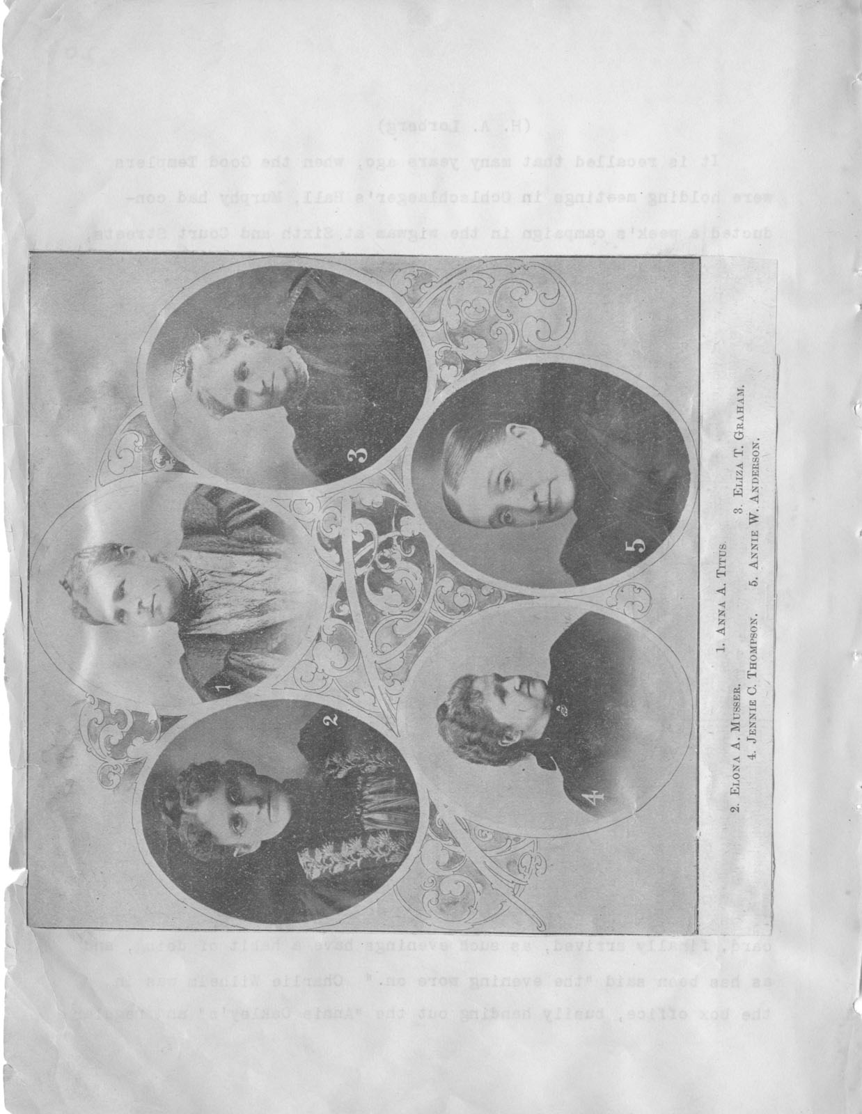 - Scanned unnumbered page from Henry A. Lorberg scrapbook containing black & white image with insets of Anna A. Titus, Elona A. Musser, Eliza T. Grahm, Jennie C. Thompson, and Annie W. Anderson.