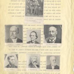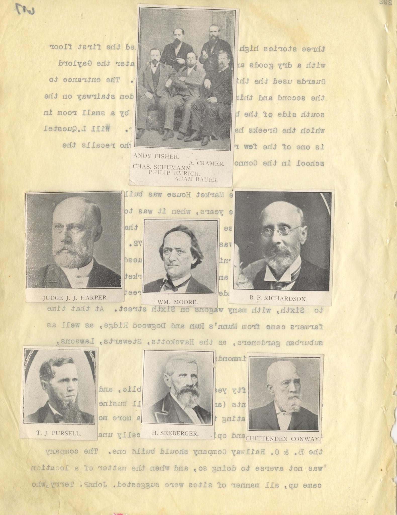 - Photo image of scanned scrapbook page. Pictured: Andy Fisher, A. Cramer, Charles Schumann, Phillip Emrich, and Adam Bauer; Judge J. J. Harper; William Moore; B. F. Richardson; T. J. Pursell; H. Seeberger; Chittenden Conway