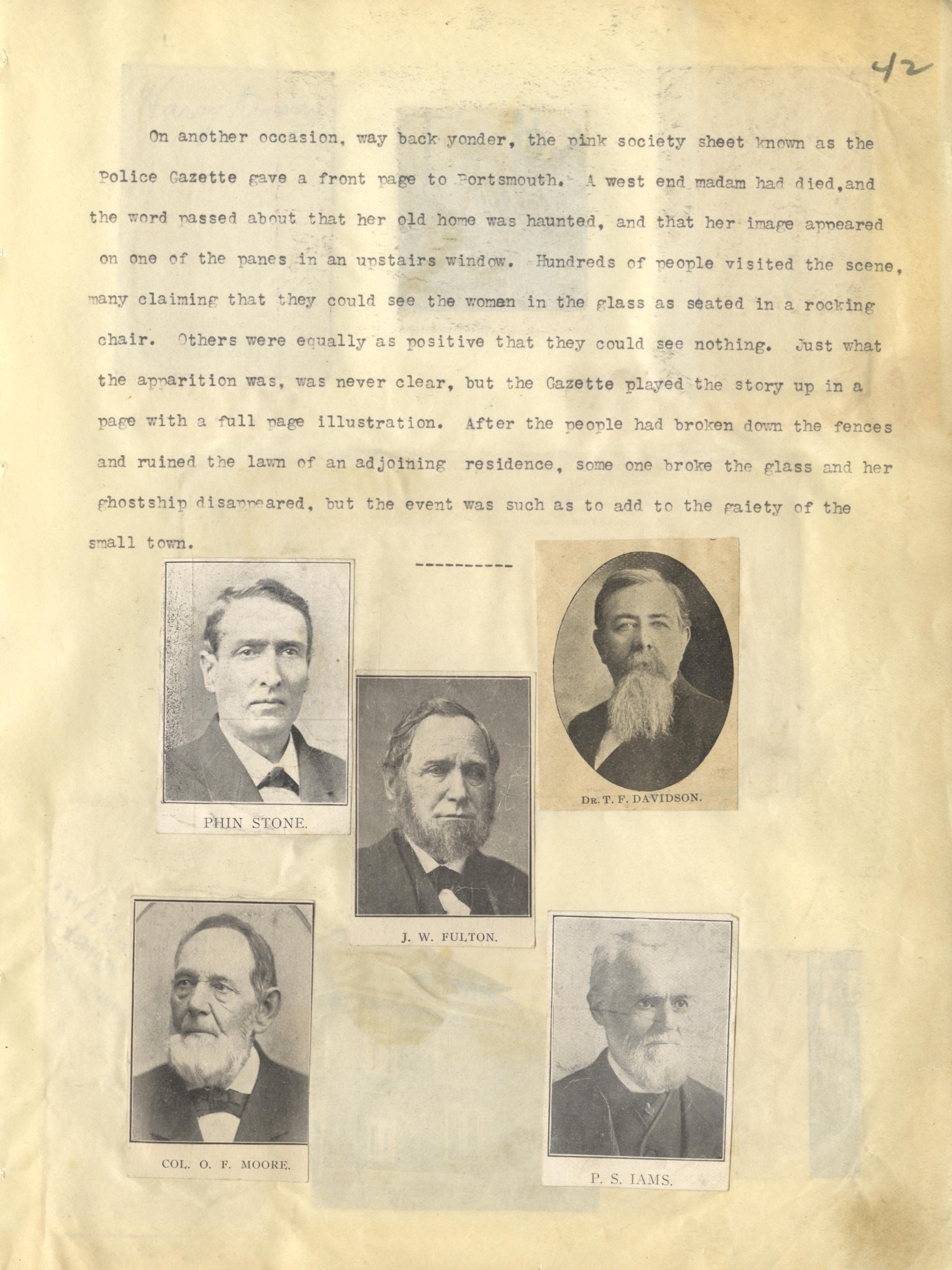 - Photo image of scanned scrapbook page 42. Police Gazette; Haunted; West End; Phin Stone; J. W. Fulton; Dr. T. F. Davidson; Col. O. F. Moore; P. S. Lams