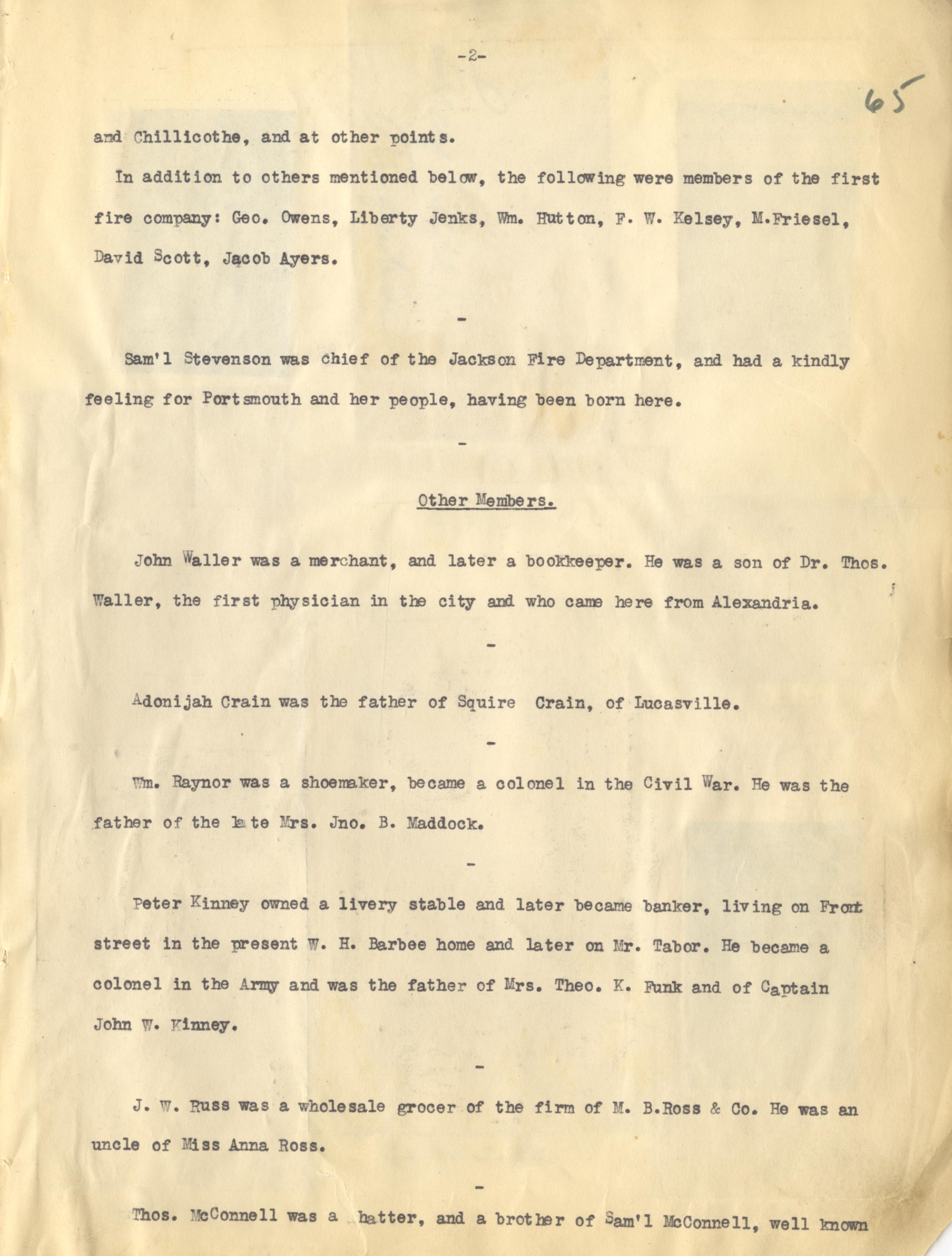 - Photo image of scanned scrapbook page 65. George Owens; Liberty Jenks; William Hutton; F.W. Kelsey; M. Friesel; David; Jacob Ayers; Samuel Stevenson; Jackson Fire Department; John Waller; Dr. Thomas Waller; Alexandria; Adonijah Crain; Squire Craine; Lucasville; William Raynor; Civil War; Mrs. John B. Maddock; Peter Kinney; Front Street; W.H. Barbee; Mrs. Theodore K. Funk; Mt. Tabor; Captain John W. Kinney; J.W. Russ; M.B. Ross & Co; Miss Anna Ross; Thomas McConnell; Samuel McConnell
