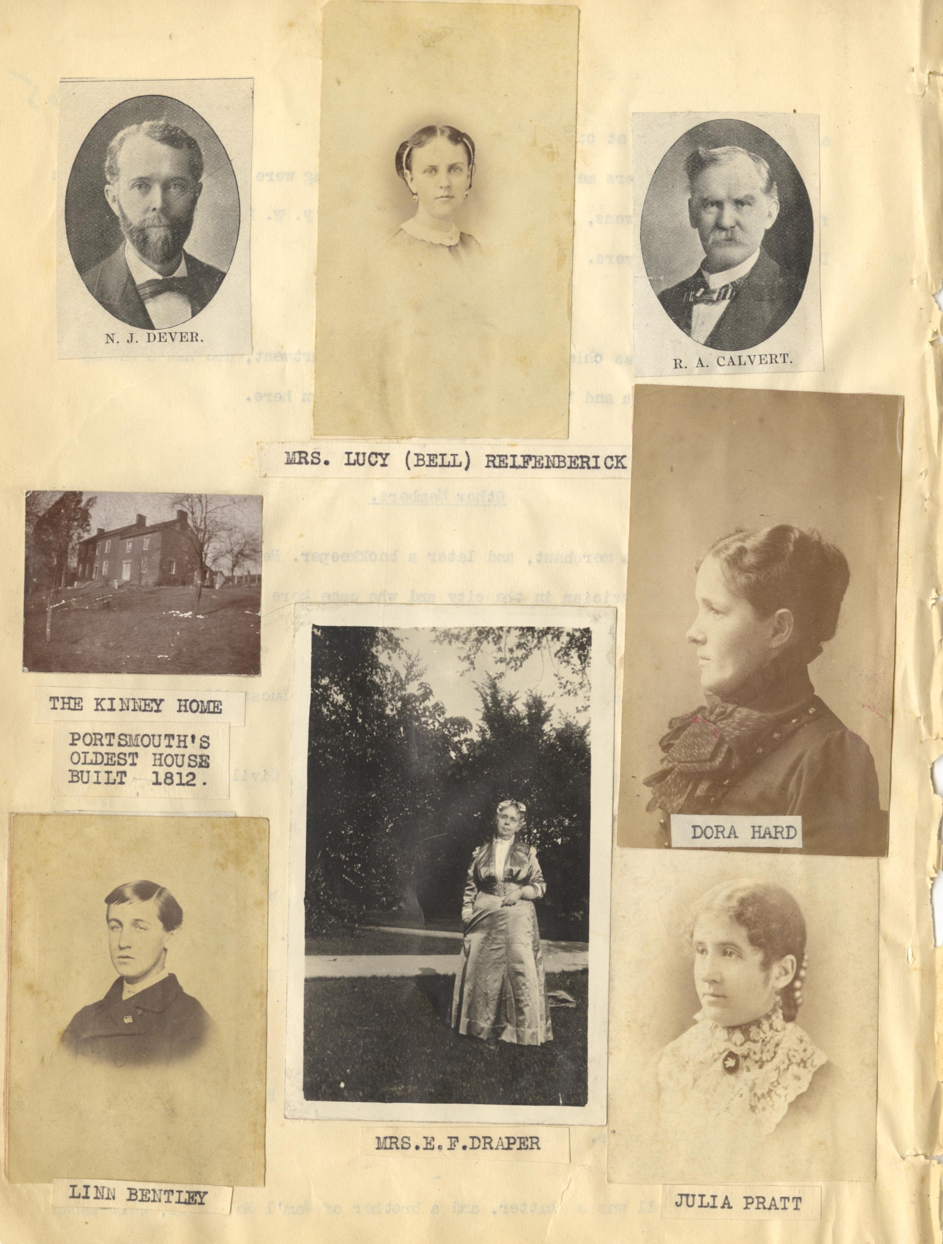 - Photo image of scanned scrapbook page. N. J. Devine; Mrs. Lucy (Bell) Reifenberick; R.A. Calvert; The Kinney Home; Portsmouth's Oldest Home (1812);Dora Hard; Mrs. E.F. Draper; Linn Bentley; Julia Pratt