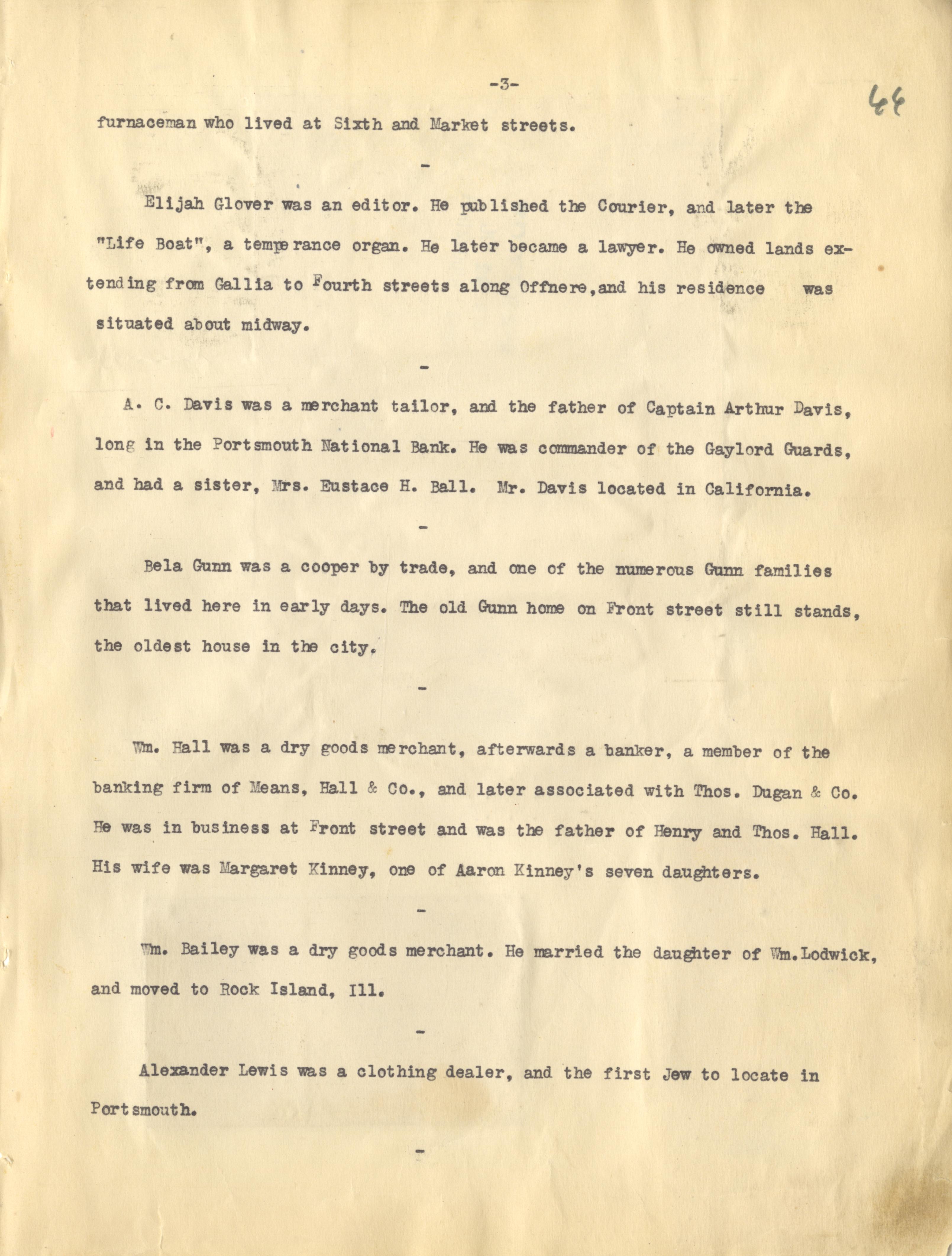- Photo image of scanned scrapbook page 66. Sixth (6th) Street; Market Street; Elijah Glover; The Courier; Life Boat; Gallia Street; Fourth (4th) Street; A.C. Davis; Captain Arthur Davis; Portsmouth National Bank; Gaylord Guards; Mrs. Eustace H. Ball; Bela Gunn; Gunn Home; Front Street; William Hall; Means, Hall & Co.; Thomas Dugan & Co.; Margaret Kinney; Aaron Kinney; William Bailey; William Lodwick; Alexander Lewis; First Jew