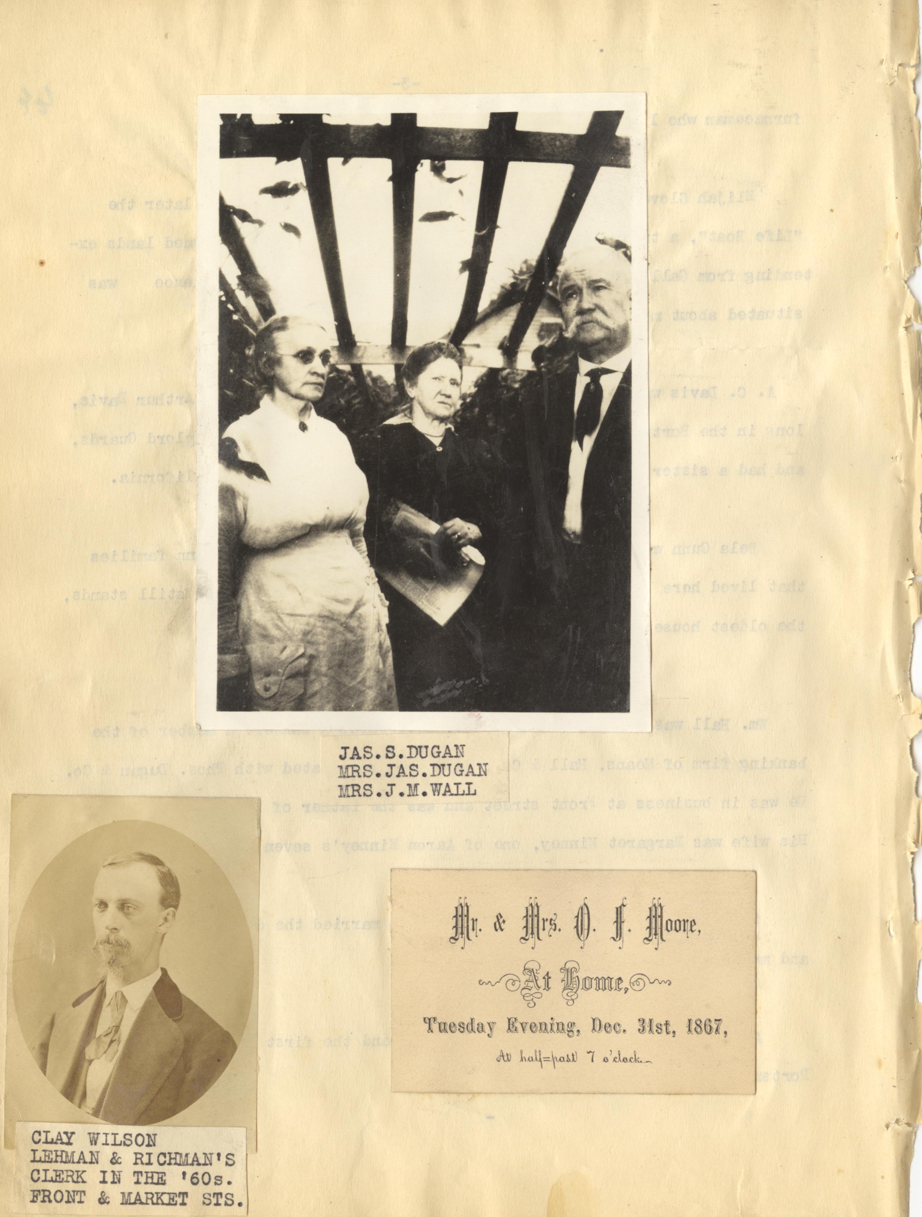 - Scanned scrapbook page. James S. Dugan; Mrs. Jas. Dugan; Mrs. J. M. Wall; Clay Wilson; Lehman & Richman's clerk (1860s); Front Street; Market Street; Mrs. & Mrs. O.F. Moore (1867)