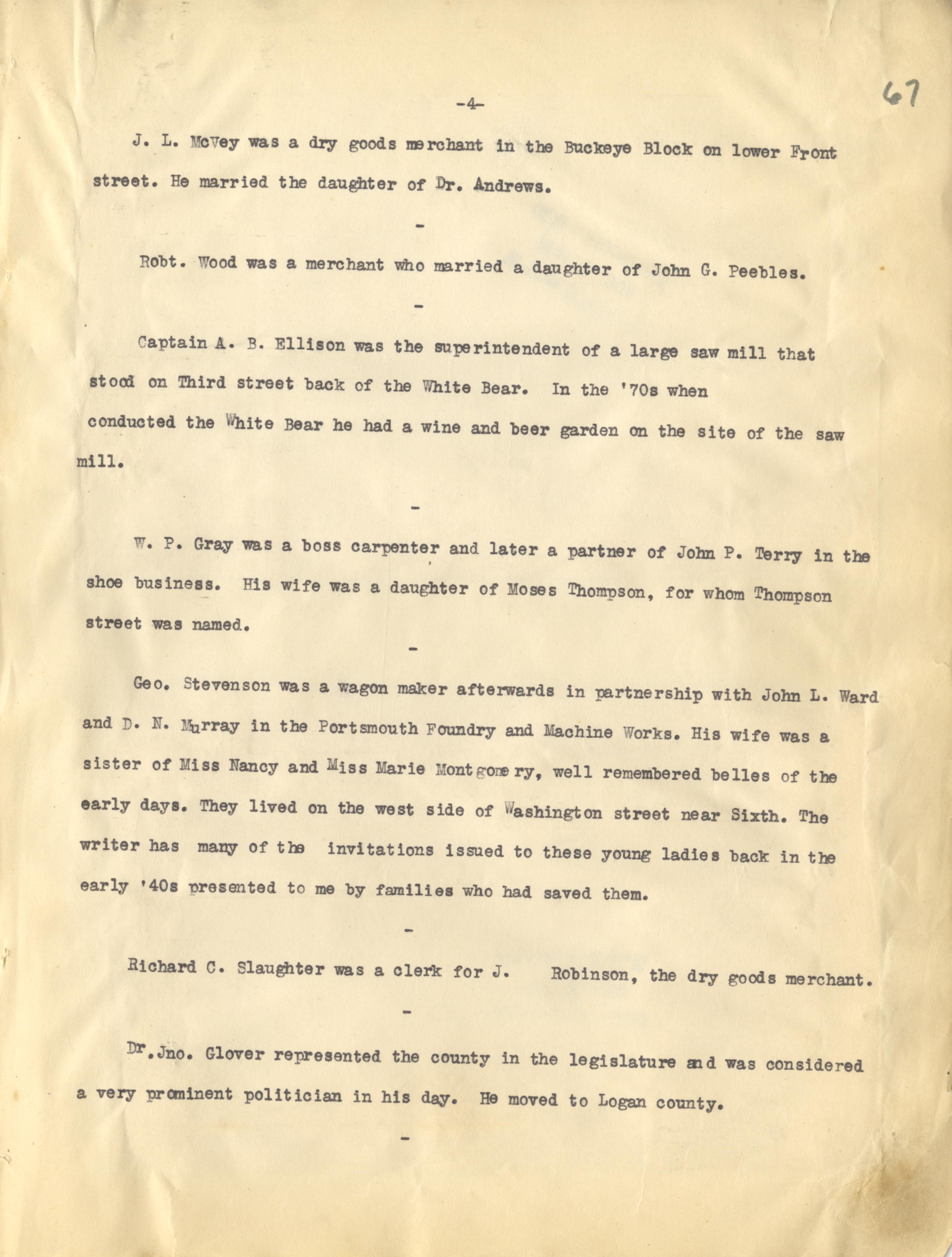 - Photo image of scanned scrapbook page 67. J.L. McVey; Merchant; Buckeye Block; Front Street; Dr. Andrews; Robt. Wood; John G. Peebles; Captain A.B. Ellison; Saw Mill; Third Street; White Bear (1870s); Wine and Beer Garden; W.P. Gray; John P. Terry; Shoe Business; Moses Thompson; Thompson Street; Geo. Stevenson; Wagon Maker; John L. Ward; D.N. Murray; Portsmouth Foundry and Machine Works; Miss Nancy Montgomery; Miss Marie Montgomery; Washington Street; Richard G. Slaughter; Clerk; J. Robinson; Dr. John Glover; Politician