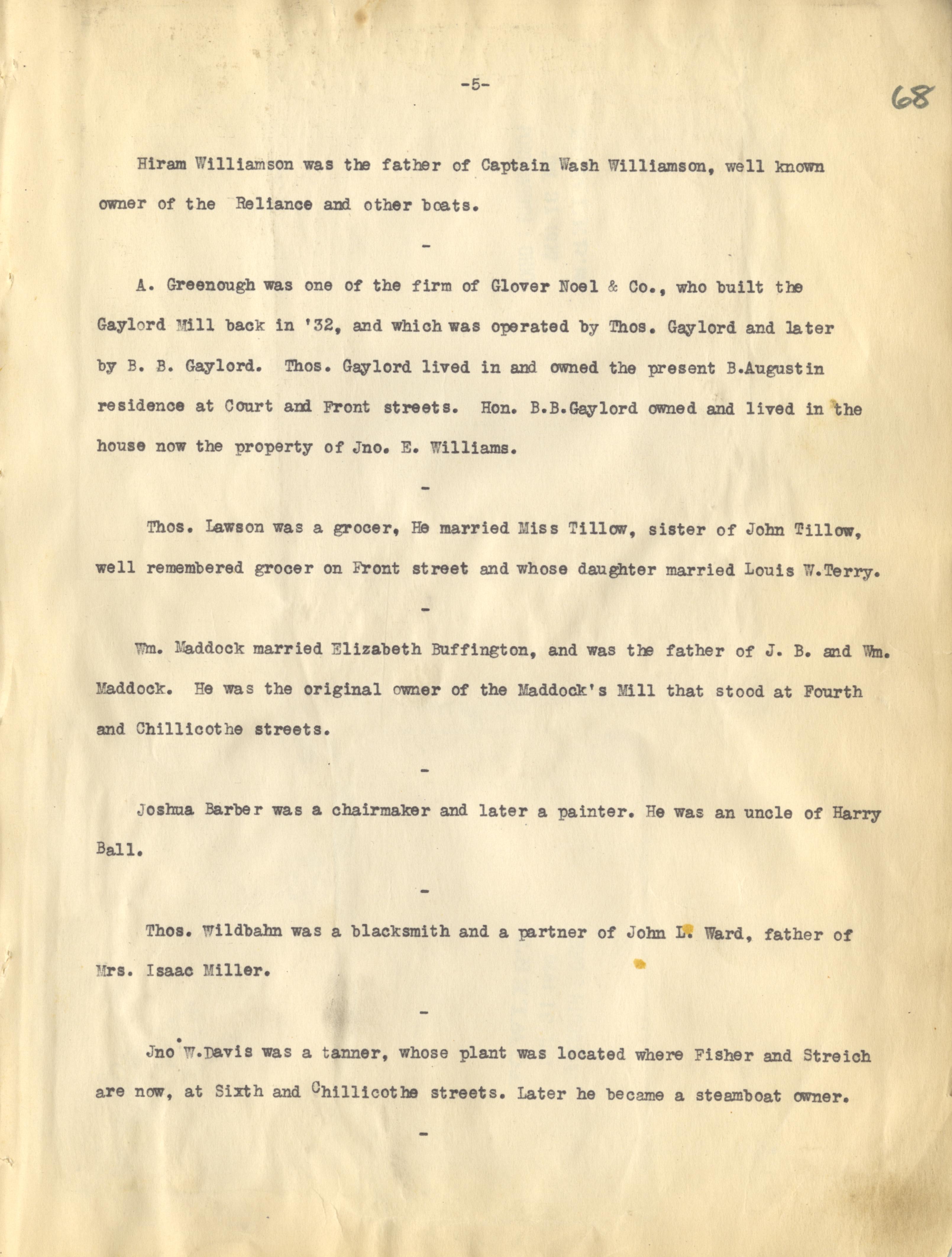 - Photo image of scanned scrapbook page 68. Hiram Williamson; Captain Washington Williamson; Reliance; A. Greenough; Glover Noel & Co; Gaylord Mill (1832); Thomas Gaylord; B.B. Gaylord; B. Augustin; Court Street; Front Street; John E. Williams; Thomas Lawson; Miss Tillow; John Tillow; Louis W. Terry; William Maddock; Elizabeth Buffington; J.B. Maddock; William Maddock; Maddock's Mill; Fourth (4th) Street; Chillicothe Street; Joshua Barber; Harry Ball; Thomas Wildbahn; Blacksmith; John L. Ward; Mrs .Isaac Miller; John W. Davis; Tanner; Fisher and Streich; Sixth (6th) Street; Steamboat Owner