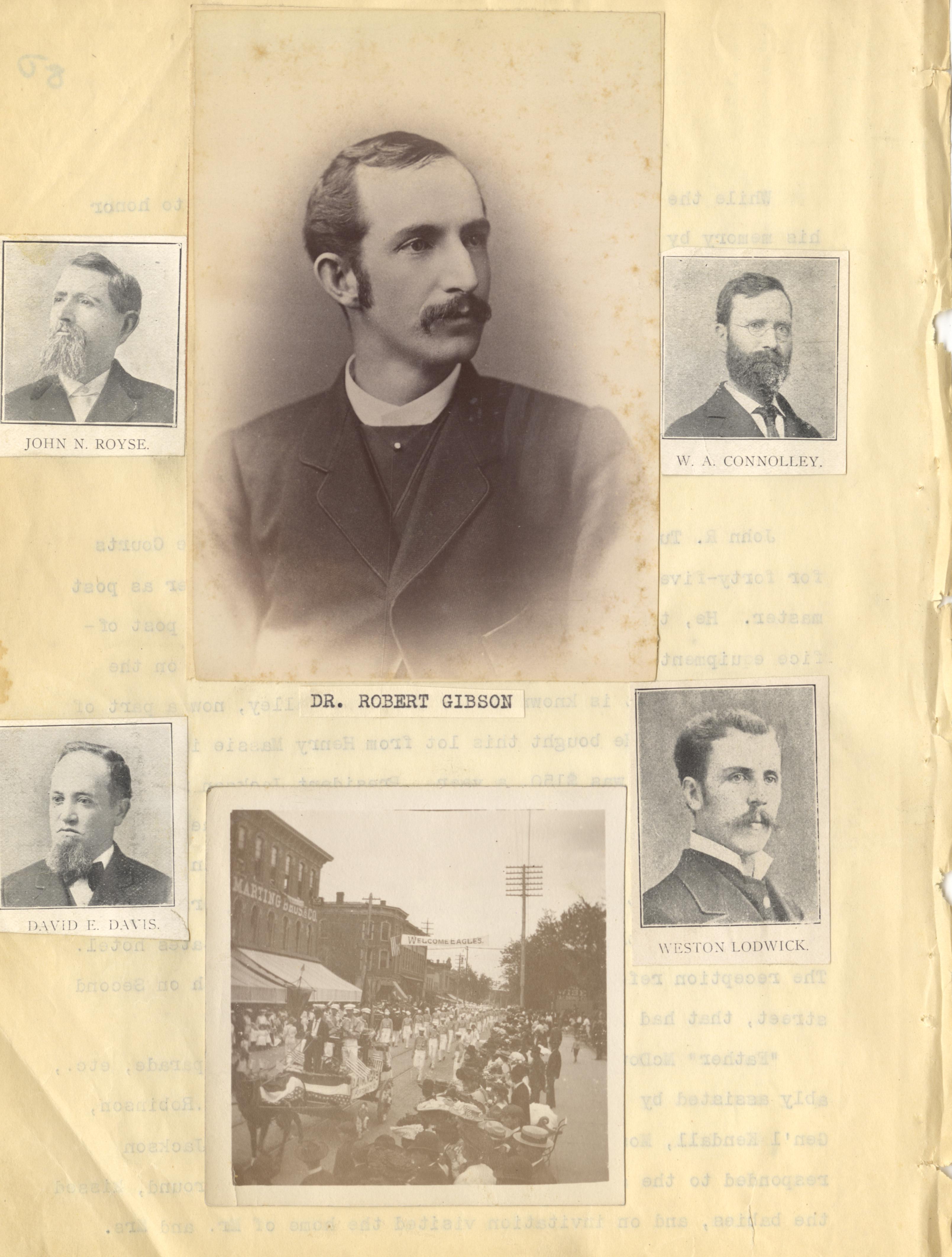 - Photo image of scanned scrapbook page. John N. Royse; Dr. Robert Gibson; W.A. Connolley; David E. Davis; Weston Lodwick; Welcome Eagles Parade