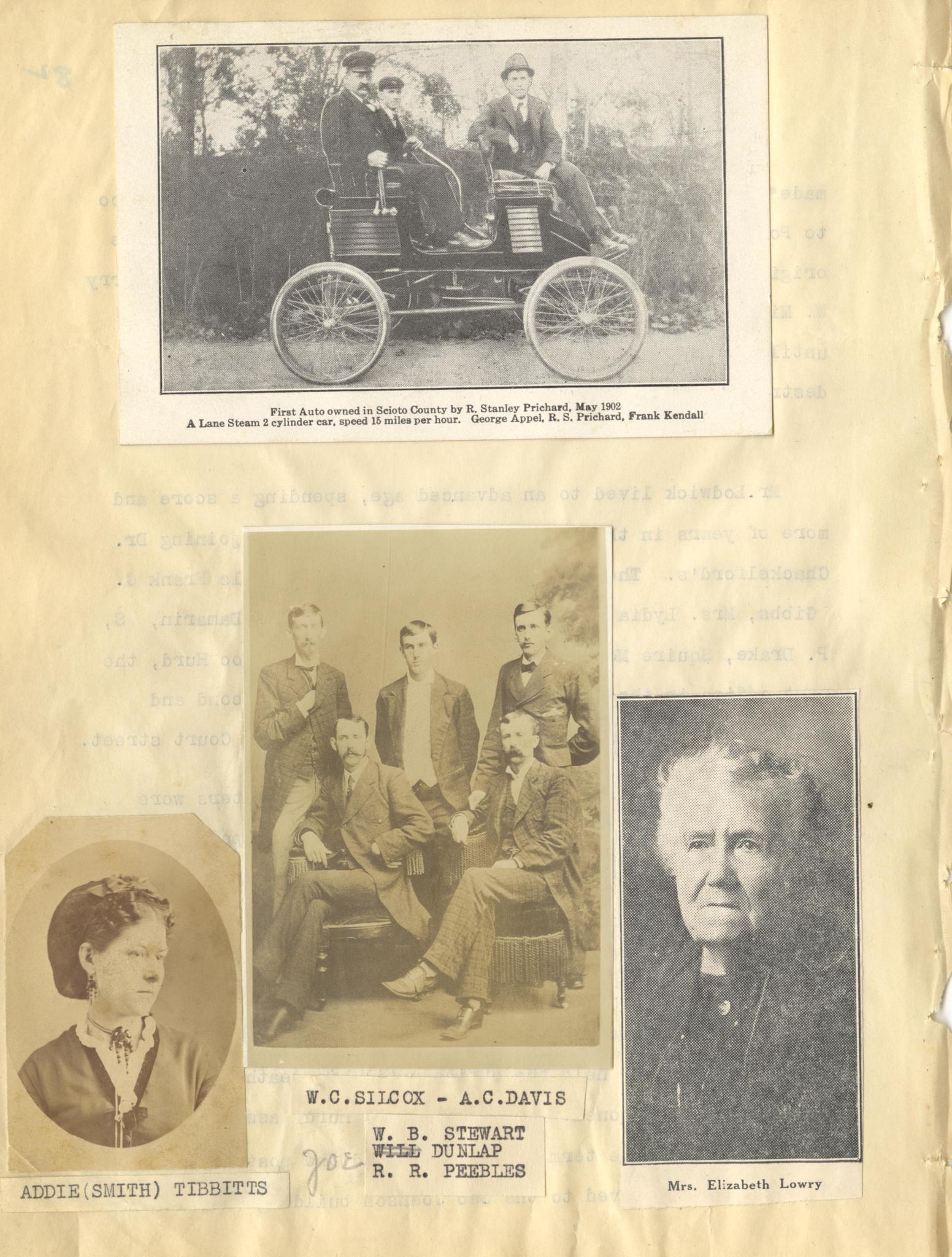 - Photo image of scanned scrapbook page. First Auto Owned in Scioto County (1902); R. Stanley Prichard; A Lane Steam 2 Cylinder Car; George Appel; Frank Kendall; Addie (Smith) Tibbitts; W.C. Silcox; A.C. Davis; W.B. Stewart; Joe Dunlap; R.R. Peebles; Mrs. Elizabeth Lowry