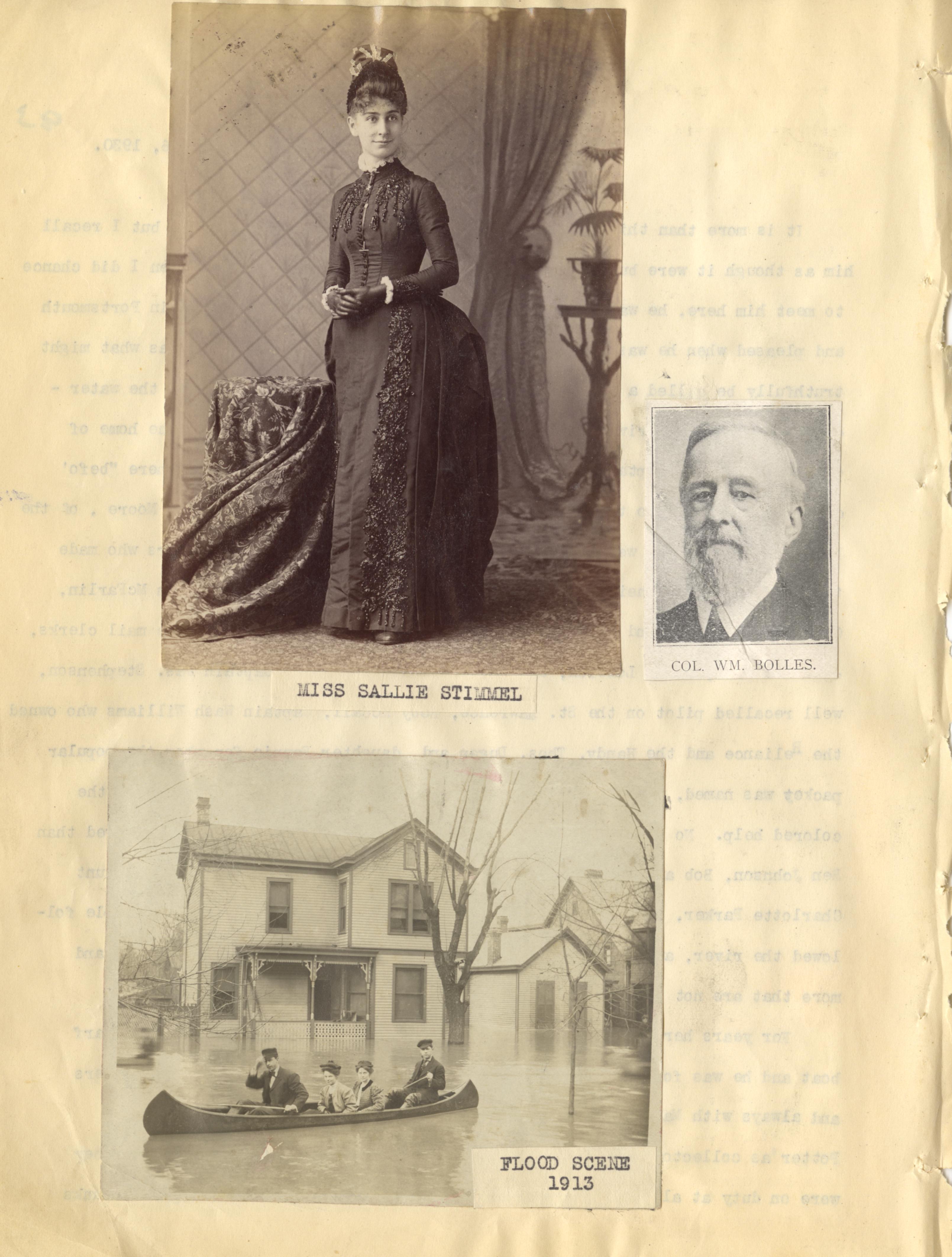 - Photo image of scanned scrapbook page. Miss Sallie Stimmel; Col. William Bolles; Flood Scene (1913)