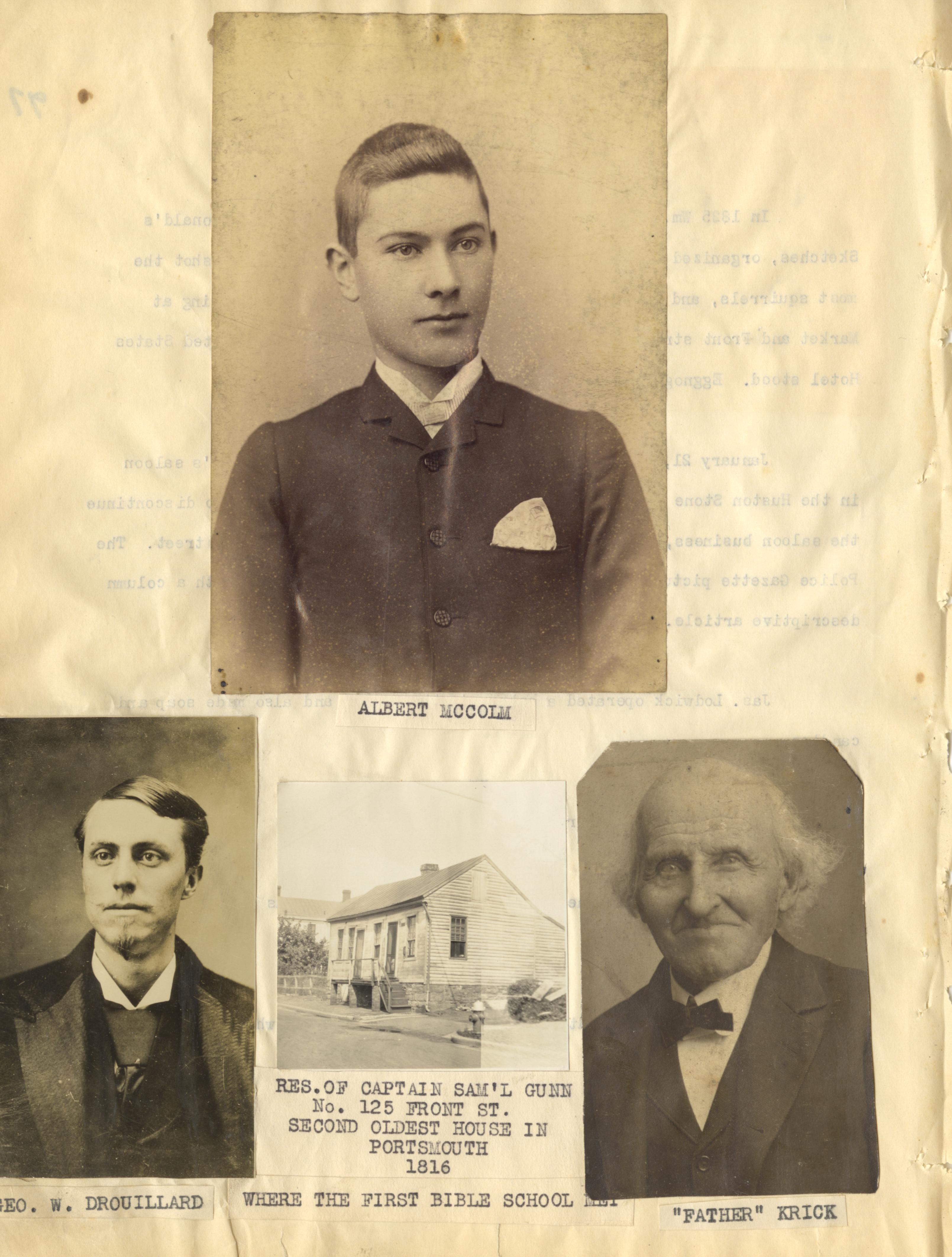 - Photo image of scanned scrapbook page. Albert McColm; George W. Drouillard; Father Krick; Residence of Captain Samuel Gunn; Front Street; Second Oldest House (1816)