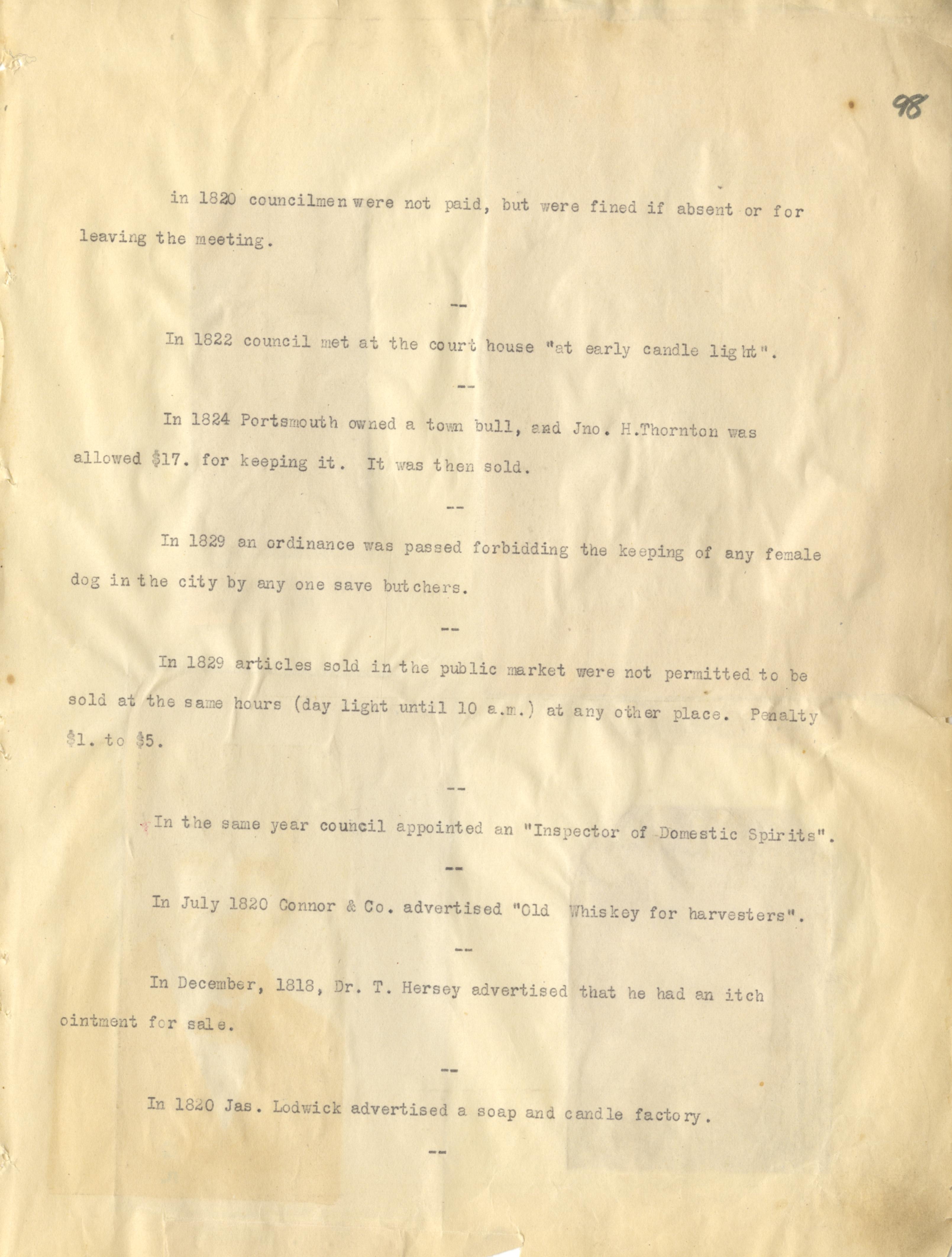 - Photo image of scanned scrapbook page 98. Councilmen (1820); Court House (1822); Town Bull (1824); John H. Thornton; Female Dog Ordinance (1829); Articles (1829); Inspector of Domestic Spirits; Connor & Co. (1820); Dr. T. Hersey (1818); James Lodwick (1820)