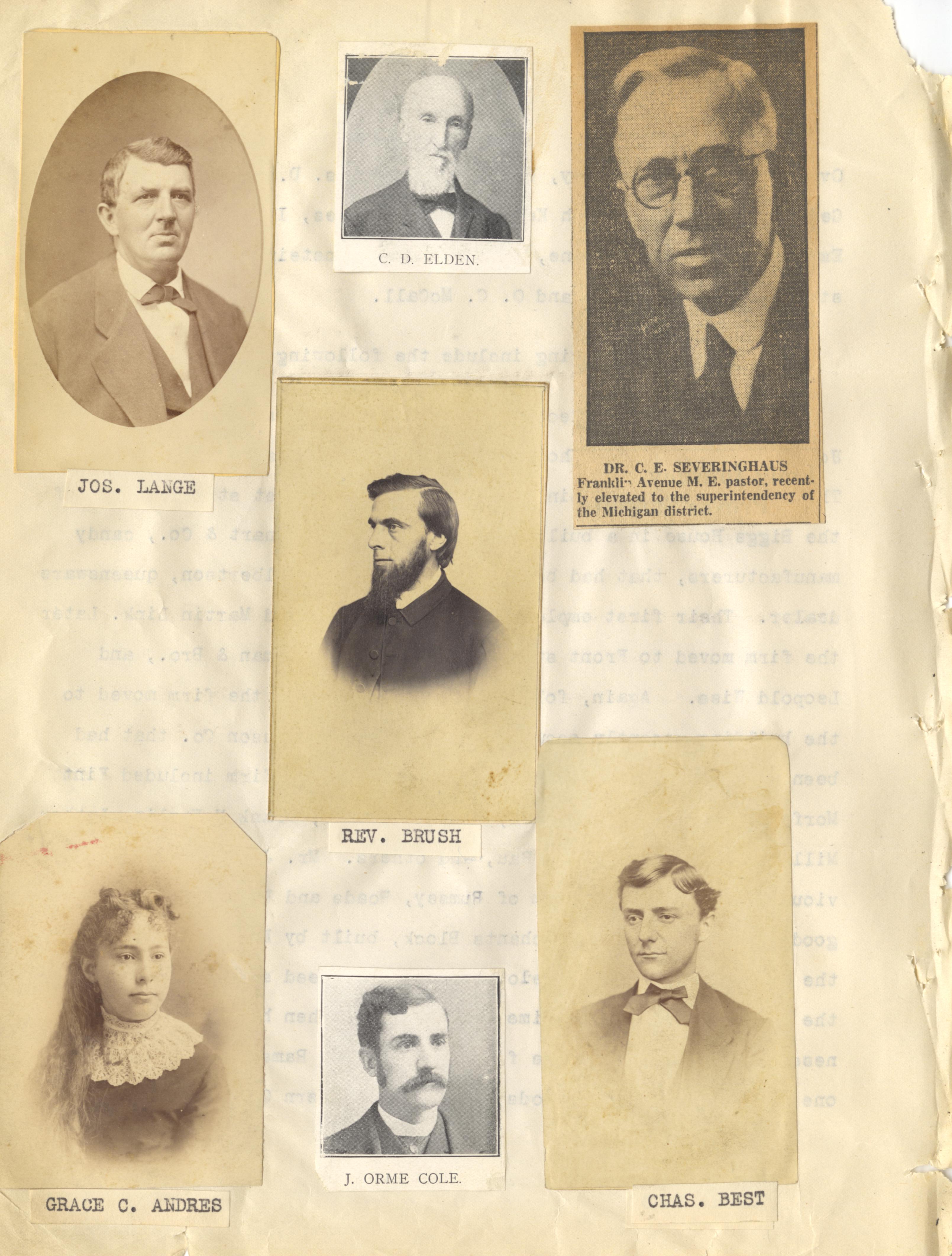 - Photo image of scanned scrapbook page. Joseph Lange; C. D. Elden; Dr. C. E. Severinghaus; Rev. Brush; Grace C. Andres; J. Orme Cole; Charles Best