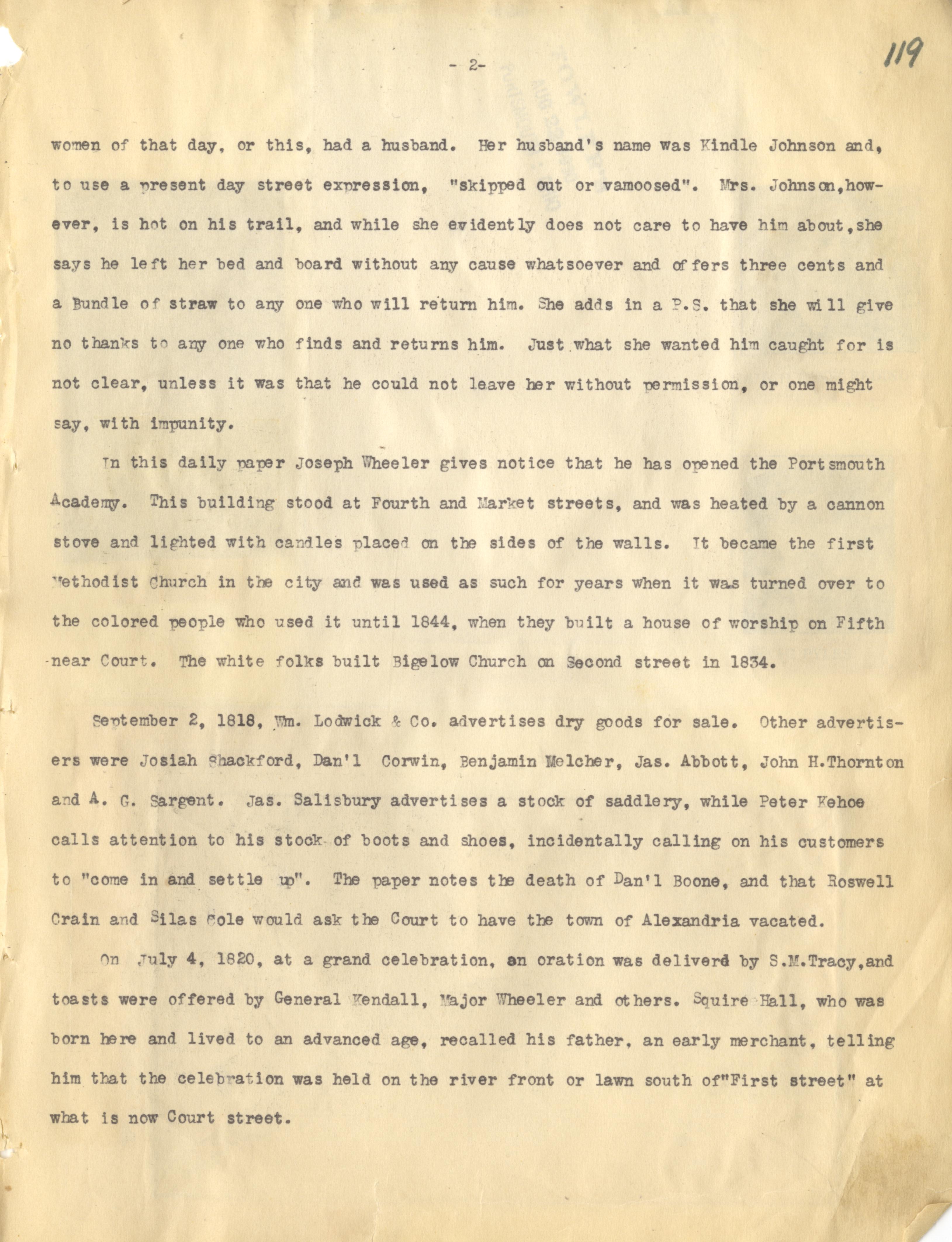- Photo image of scanned scrapbook page 119. Kindle Johnson; Mrs. Johnson; Joseph Wheeler; Portsmouth Academy; Fourth (4th) Street; Market Street; First Methodist Church (1844); Bigelow Church (1834); William Lodwick & Co.(1818); Josiah Shackford; Dan'l Corwin; Benjamin Melcher; James Abbott; John T. Thornton; A.C. Sargent; Jas. Salisbury; Peter Kehoe; Roswell Crain; Silas Cole; S.M. Tracy (1820); General Kendall; Major Wheeler; Squire Hall; River Front; First (1st) Street; Court Street