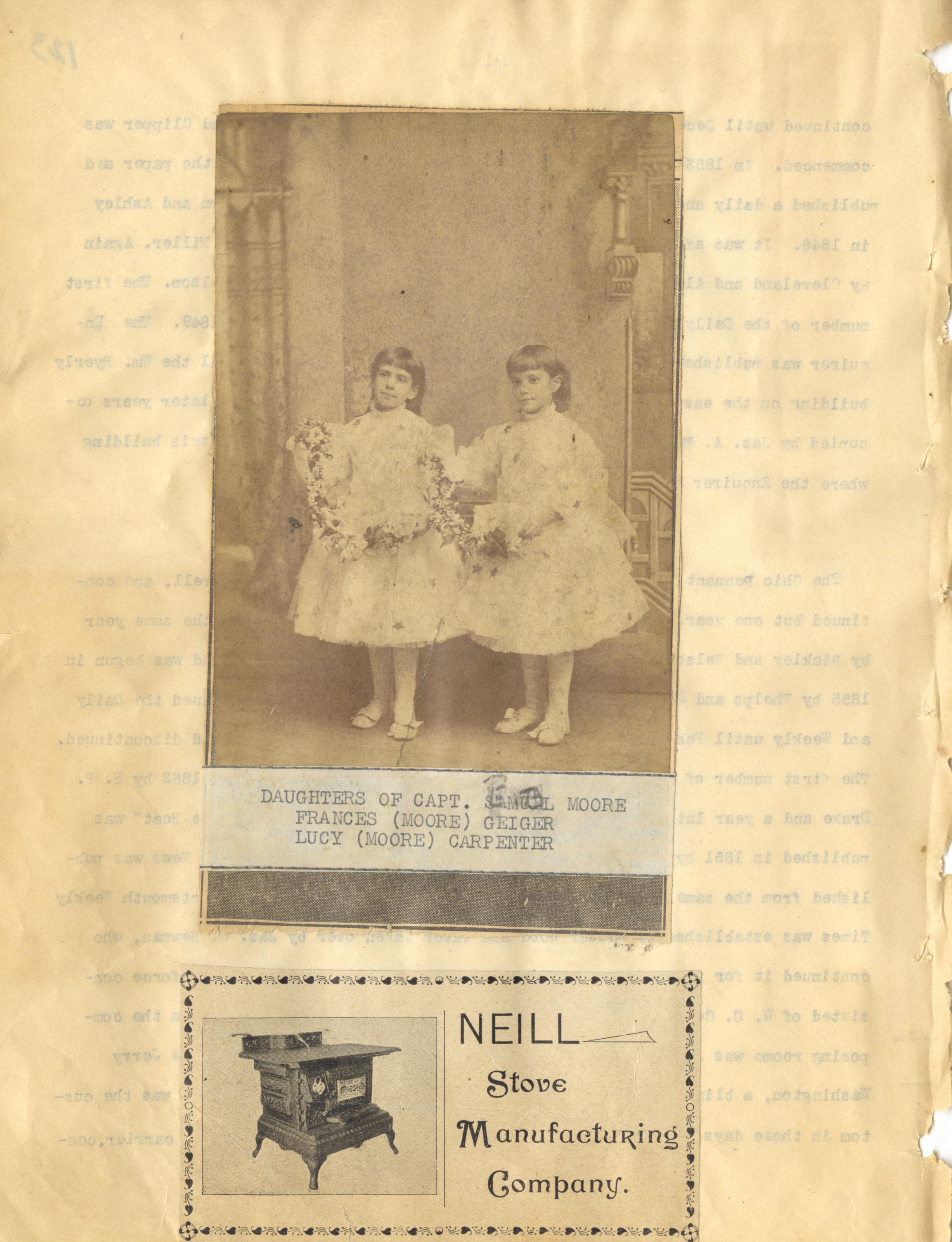 - Photo image of scanned scrapbook page. Daughters of Capt. (E.B.) Moore; Frances (Moore) Geiger; Lucy (Moore) Carpenter; Neill Stove Manufacturing Company