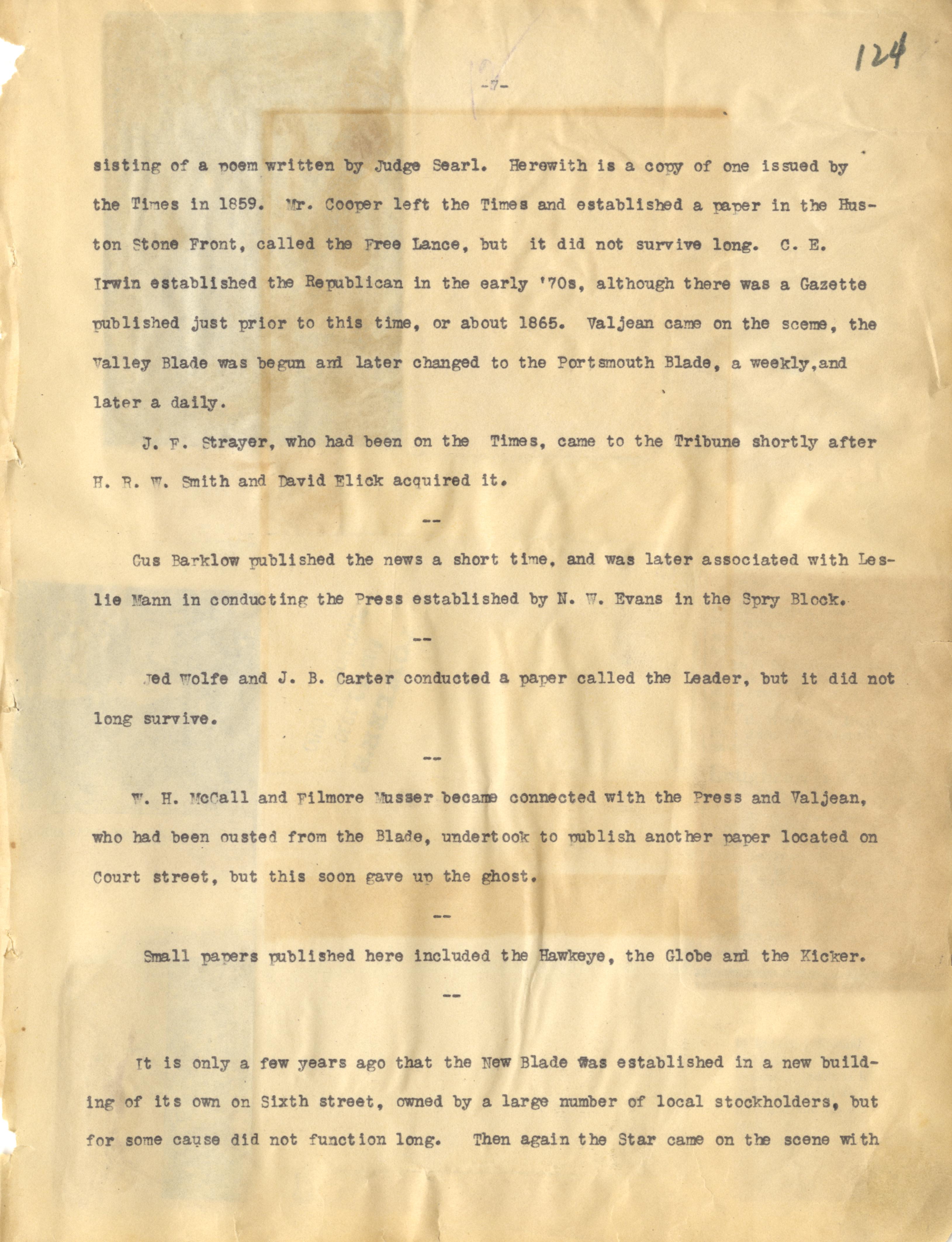 - Photo image of scanned scrapbook page 124. Judge Searl; The Times (1859); Mr. Cooper; Huston Stone Front; Free Lance; C.E. Irwin; The Republican (1870s); Gazette (1865); Valjean; Valley Blade; J.F. Strayer; H.R.W. Smith; David Elick; Gus Barklow; Leslie Mann; The Press; N.W. Evans; Spry Block; Jed Wolfe; J.B. Carter; The Leader; W. H. McCall; Filmore Musser; The Blade; Court Street; The Hawkeye; The Globe; The Kicker; New Blade; Sixth (6th) Street; The Star