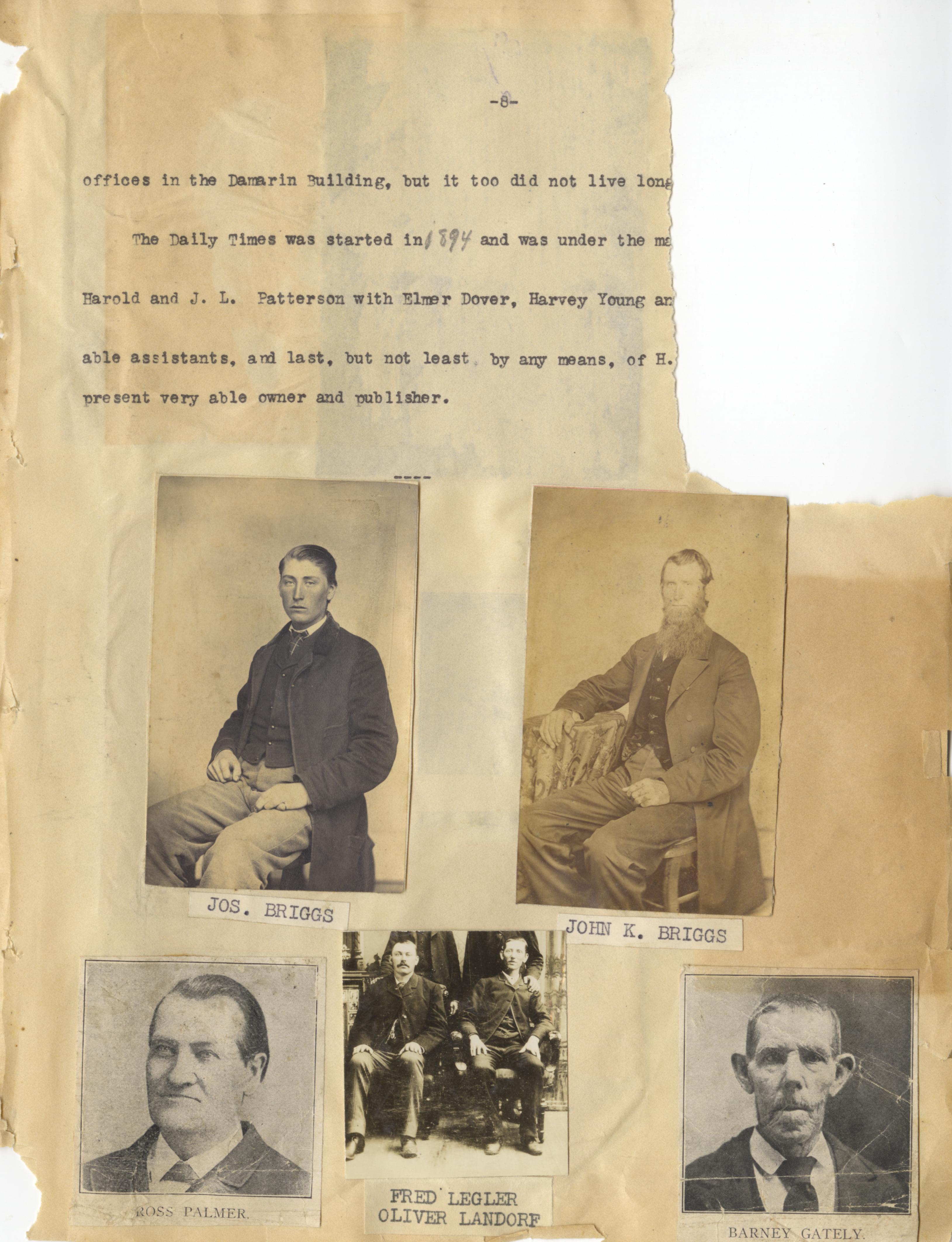 - Photo image of scanned scrapbook page. Damarin Building; The Daily Times (1894); Harold; J.L. Patterson; Elmer Dover; Harvey Young; Joseph Briggs; John K. Briggs; Ross Palmer; Fred Legler: Oliver Landorf; Barney Gately