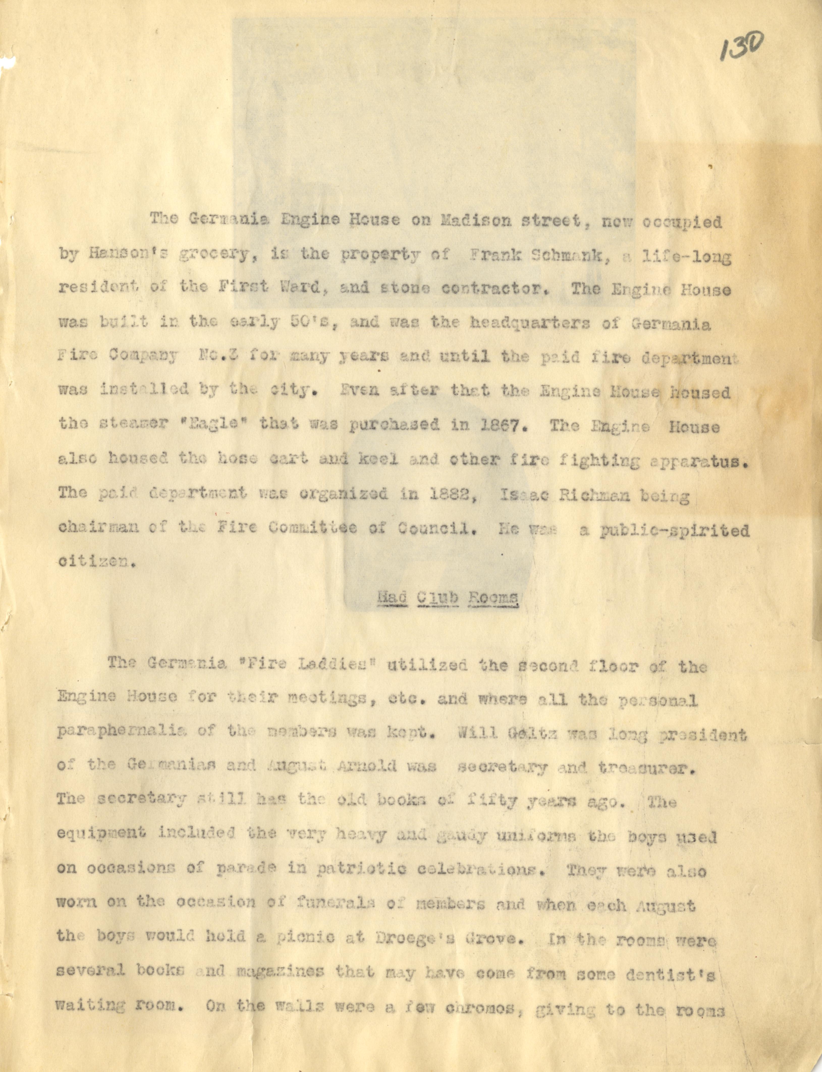 - Photo image of scanned scrapbook page 130. The Germania Engine House (1850s); Madison Street; Hanson's Grocery; Frank Schmank; First Ward; Germania Fire Company No. 2; Eagle (1867); Isaac Richman (1882); The Germania 'Fire Laddies'; Will Geltz; August Arnold; Droege's Grove