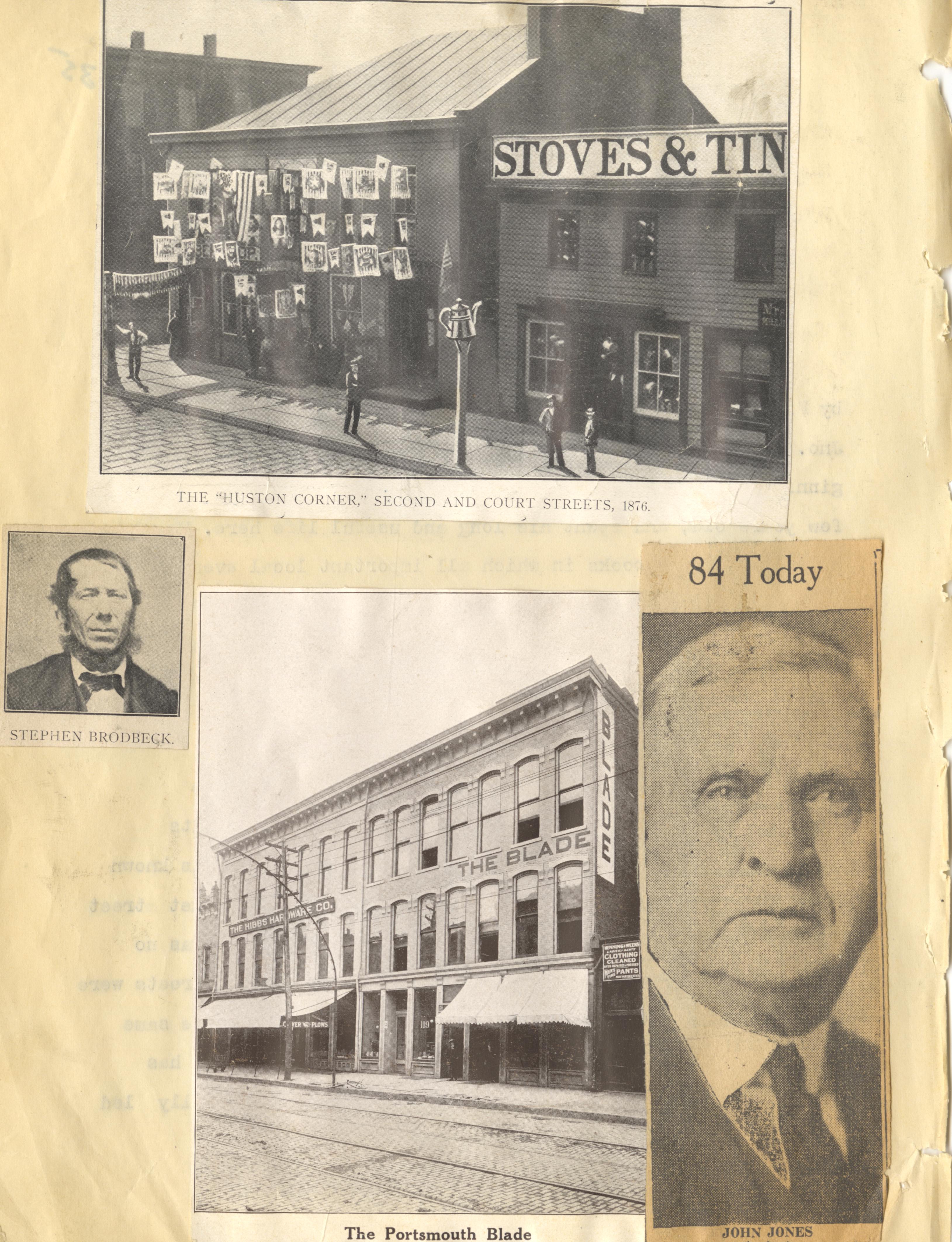 - Photo image of scanned scrapbook page. The Huston Corner (1876); Second (2nd) Street; Court Street; Stoves & Tin; Stephen Brodbeck; John Jones; The Portsmouth Blade