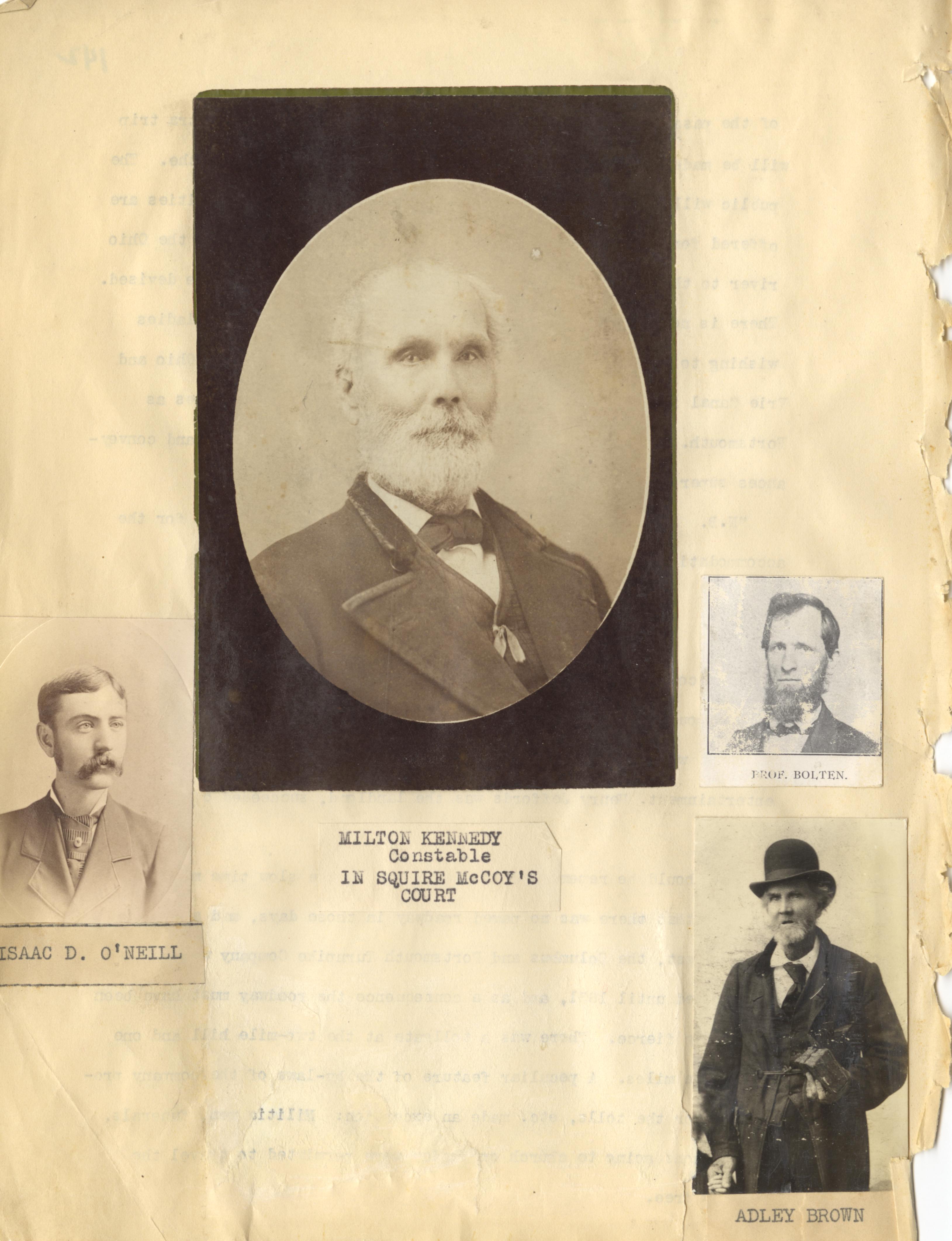 - Photo image of scanned scrapbook page. Isaac D. O'Neill; Milton Kennedy; Constable; Squire McCoy's Court; Prof. Bolten; Adley Brown