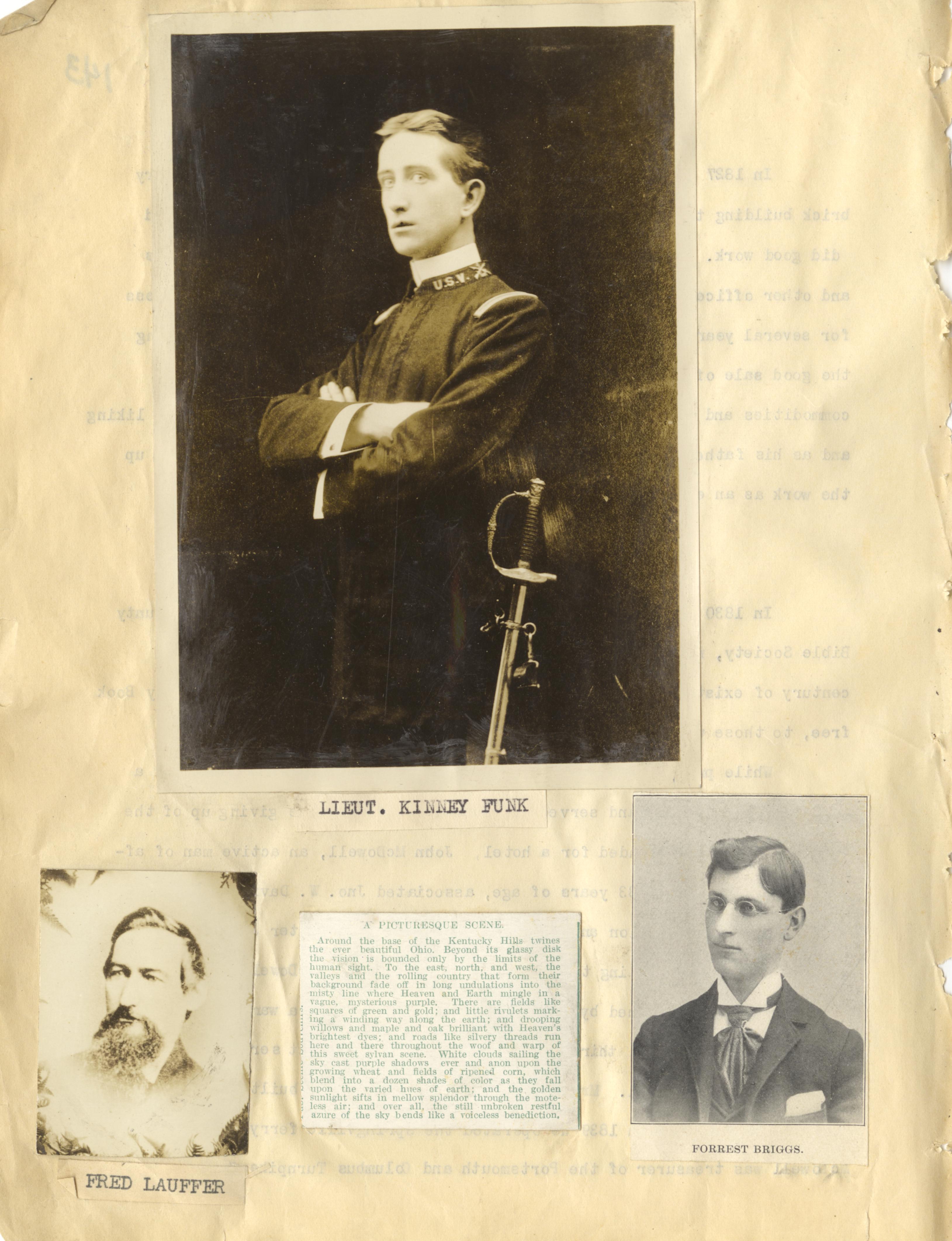 - Photo image of scanned scrapbook page. Lieut. Kinney Funk; Fred Lauffer; Forrest Briggs; A Picturesque Scene; Kentucky Hills