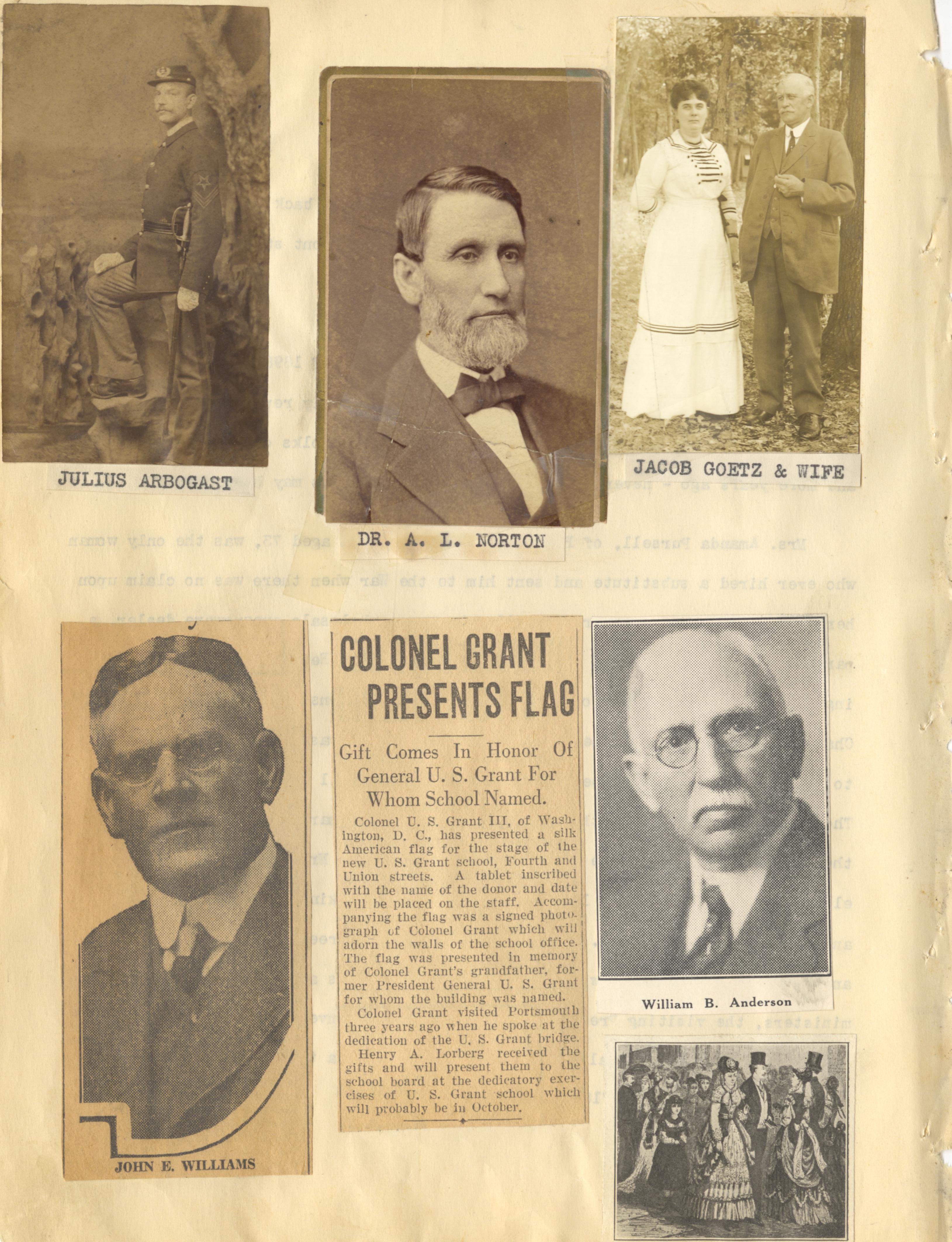 - Photo image of scanned scrapbook page. Julius Arbogast; Dr. A.L. Norton; Jacob Goetz & Wife; John E. Williams; Colonel Grant; Grant School; William B. Anderson