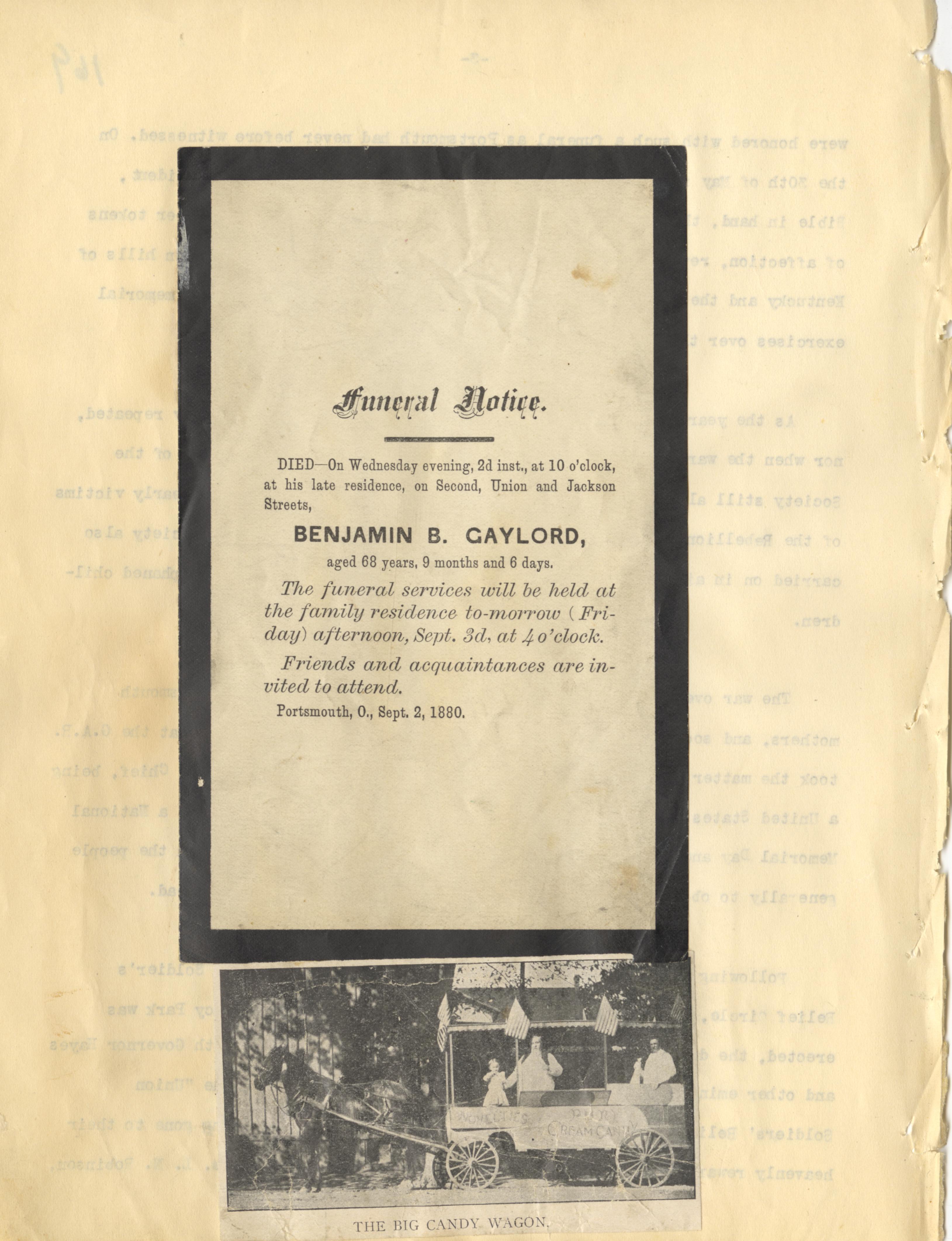 - Scanned scrapbook page. Funeral Notice; Benjamin B. Gaylord (1880); The Big Candy Wagon