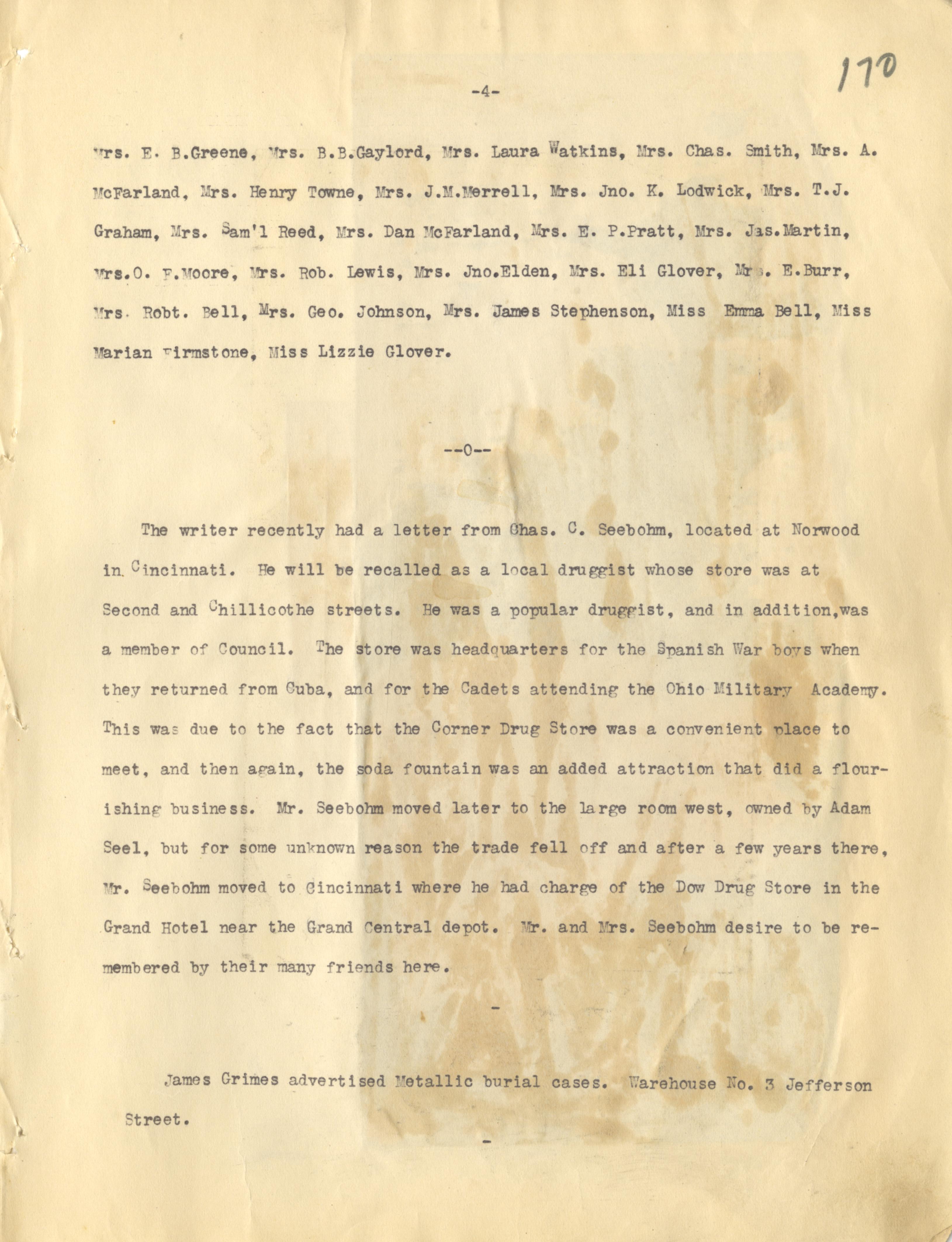 - Photo image of scanned scrapbook page 170. Mrs. E.B. Greene; Mrs. B.B. Gaylord; Mrs. Laoura Watkins; Mrs. Charles Smith; Mrs. A. McFarland; Mrs. Henry Towne; Mrs. J. M.Merrell; Mrs. John K. Lodwick; Mrs. T.J. Graham; Mrs. Sam'l Reed; Mrs. Dan McFarland; Mrs. E. P. Pratt; Mrs. James Martin; Mrs .O.F. Moore; Mrs. Robert Lewis; Mrs. John Elden; Mrs .Eli Glover; Mrs. E. Burr; Mrs. Robert Bell; Mrs. George Johnson; Mrs. James Stephenson; Miss Emma Bell; Miss Marian Firmstone; Miss Lizzie Glover; Charles C. Seebohm; Second (2nd) Street; Chillicothe Street; Spanish War; Ohio Military Academy; Corner Drug Store; Adam Seel; Dow Drug Store; Grand Hotel; James Grimes; Warehouse No. 3; Jefferson Street