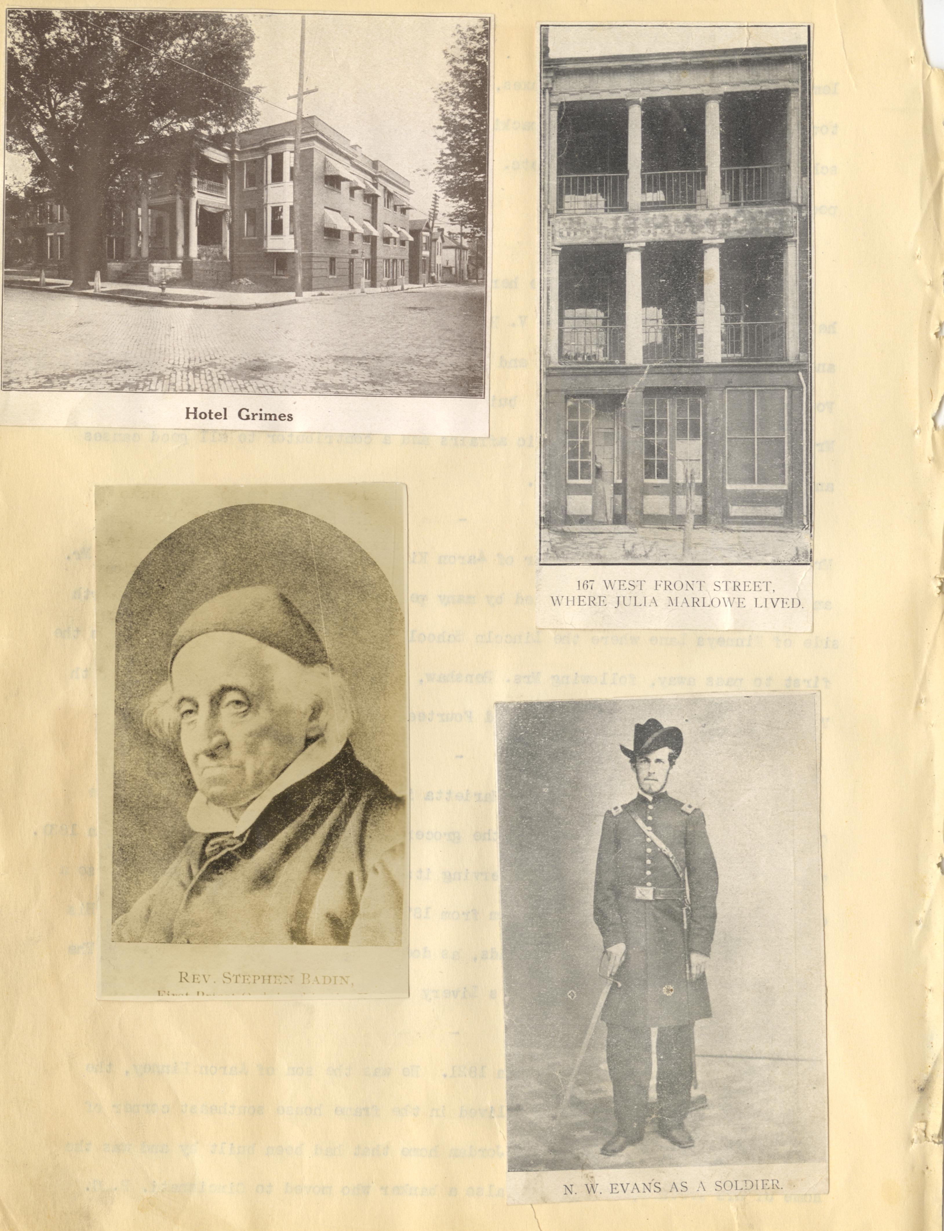 - Photo image of scanned scrapbook page. Hotel Grimes; 167 West Front Street; Julia Marlowe; Rev. Stephen Badin; N.W. Evans as a Soldier