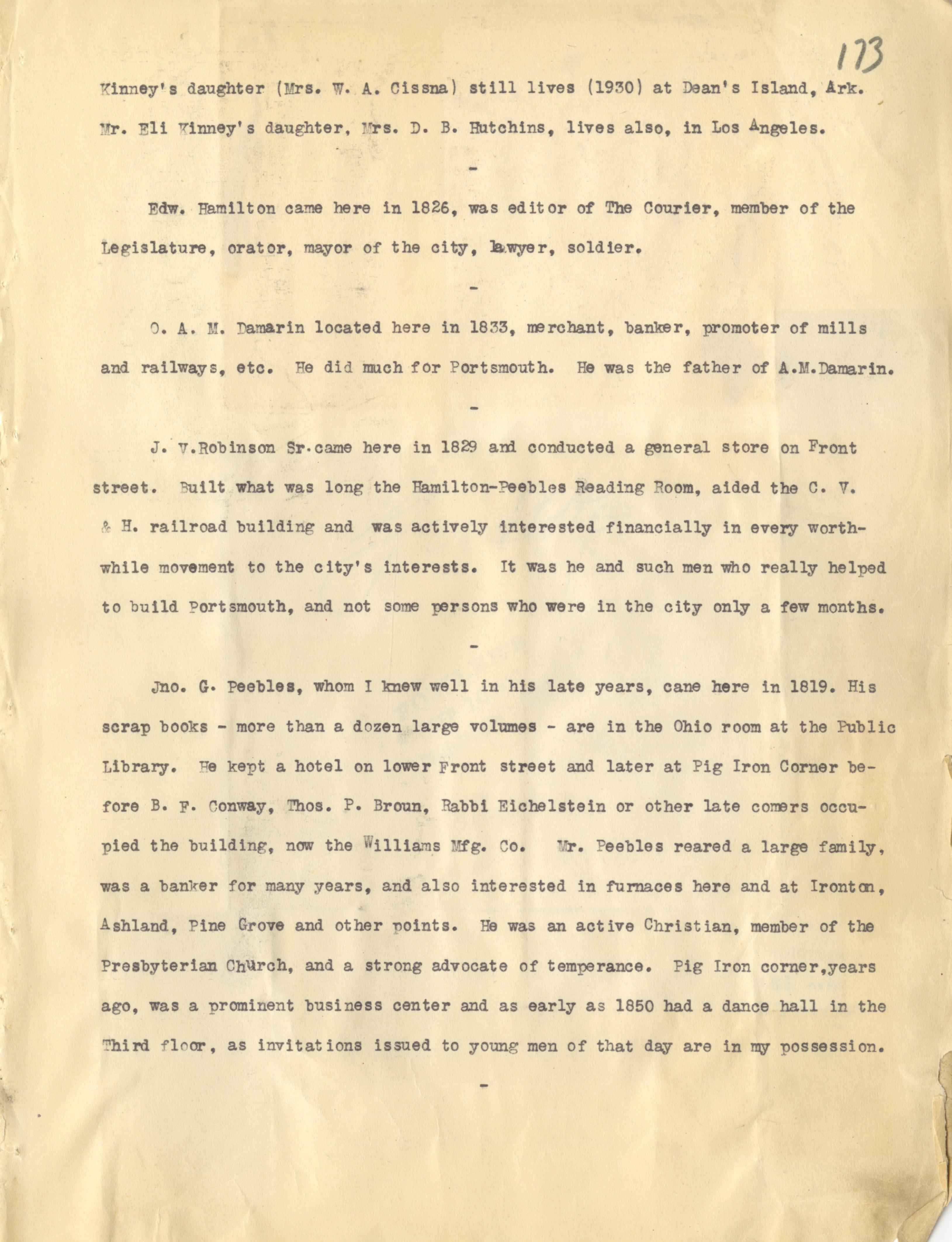 - Photo image of scanned scrapbook page 173. Kinney's Daughter (Mrs. W.A. Cissna) (1930); Mrs. Eli Kinney's Daughter; Mrs. D.B. Hutchins; Edward Hamilton (1826); The Courier; O.A.M. Damarin (1833); A.M. Damarin; J.V. Robinson Sr. (1829); Front Street; Hamilton-Peebles Reading Room; C.V. & H. Railroad; John G. Peebles (1819); Ohio Room; Public Library; Hotel; Pig Iron Corner; B.F. Conway; Thomas P. Broun; Rabbi Eichelstein; Williams Mfg. Co; Presbyterian Church; Dance Hall (1850)