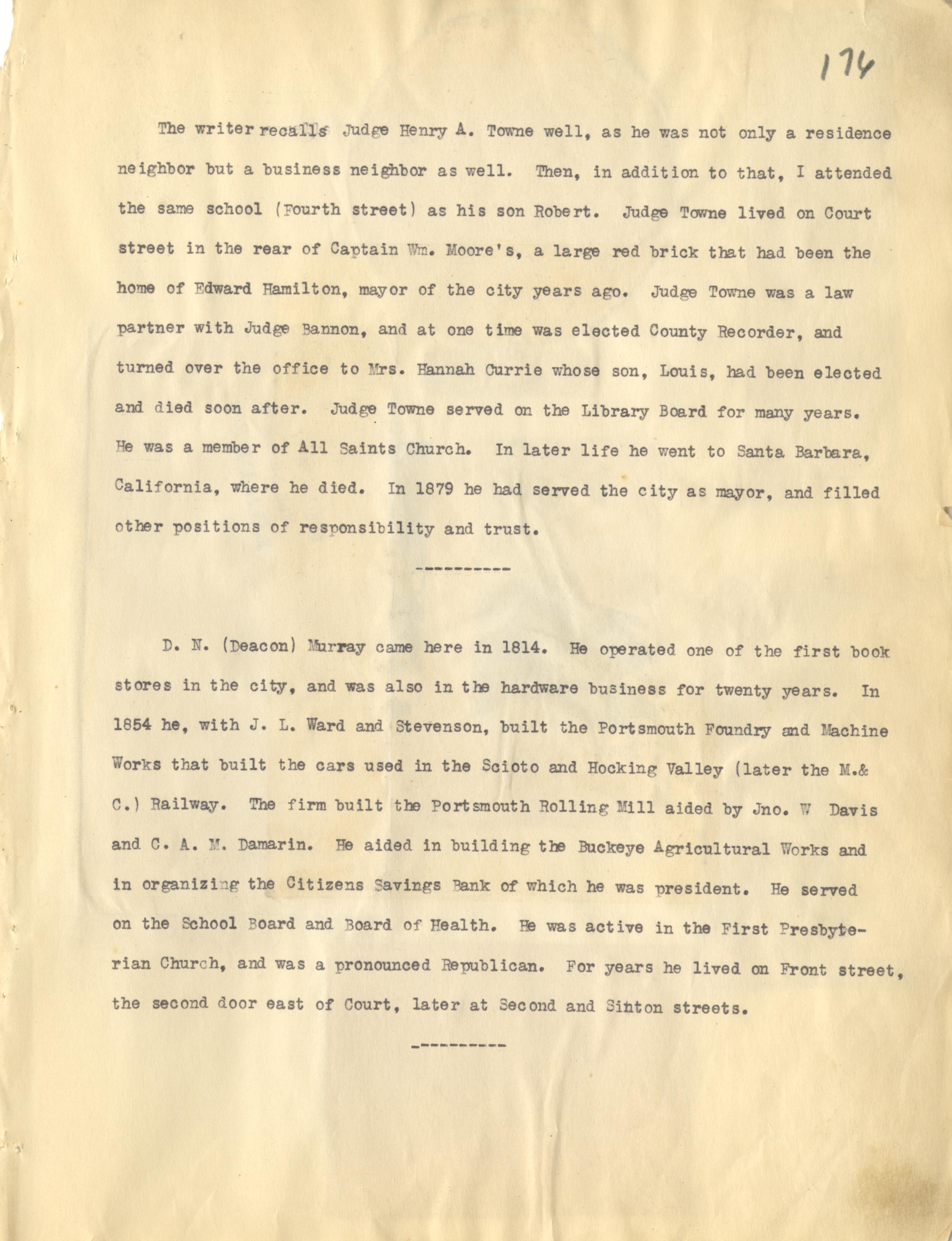 - Photo image of scanned scrapbook page 176. Judge Henry A. Towne; Fourth Street; Court Street; Captain William Moore; Edward Hamilton; Judge Bannon; County Recorder; Mrs. Hannah Currie; Library Board; All Saints Church; Mayor (1879); D.N. (Deacon) Murray (1814); J.L. Ward and Stevenson (1854); Portsmouth Foundry and Machine Works; Scioto and Valley (M. & C.) Railway; Portsmouth Rolling Mill; John W. Davis; C.A.M. Damarin; Buckeye Agricultural Works; Citizens Savings Bank; School Board; Board of Health; First Presbyterian Church; Republican; Front Street; Sinton Street