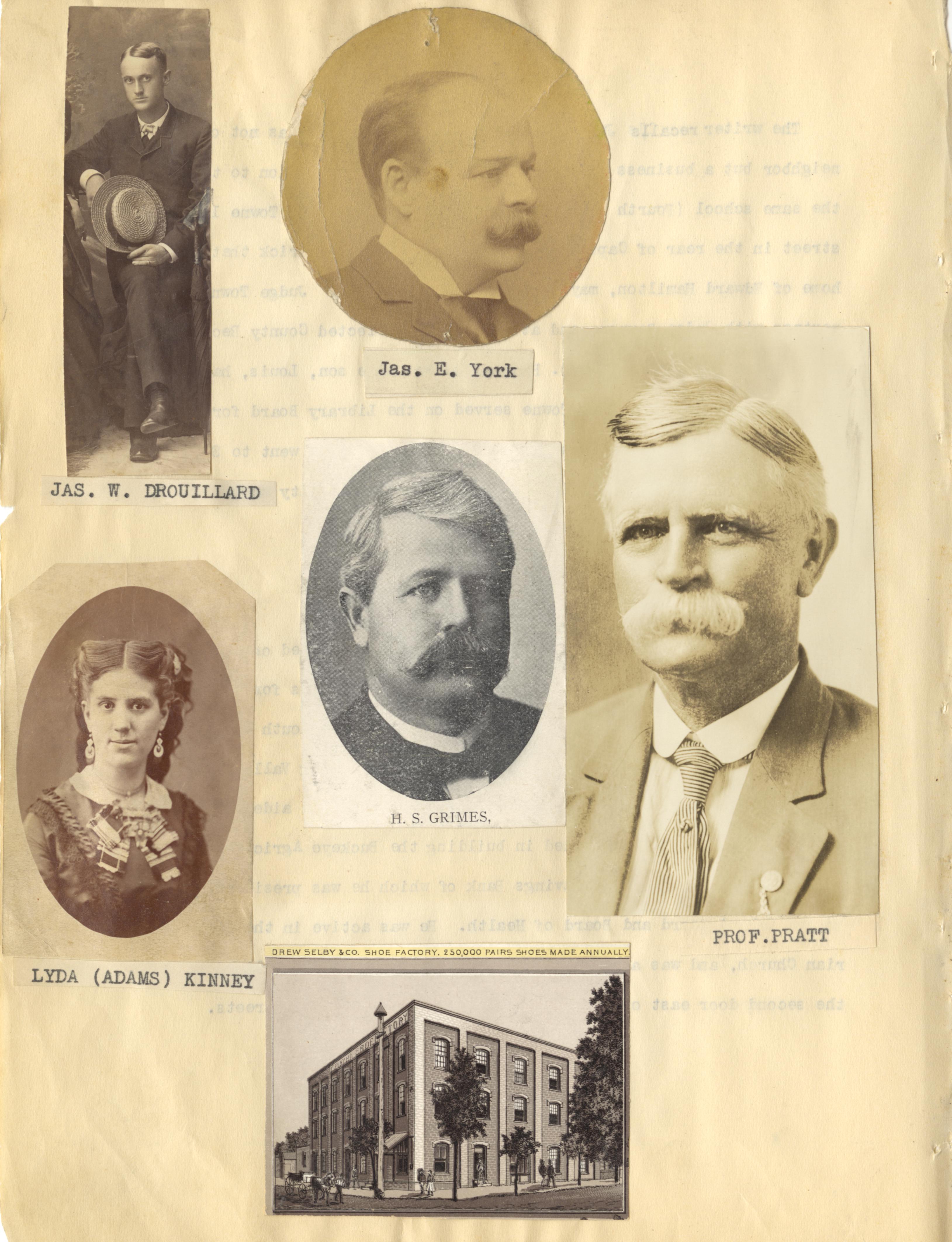 - Photo image of scanned scrapbook page. James W. Drouillard; James E. York; Lyda (Adams) Kinney; H.S. Grimes; Prof. Pratt; Drew Selby & Co; Shoe Factory