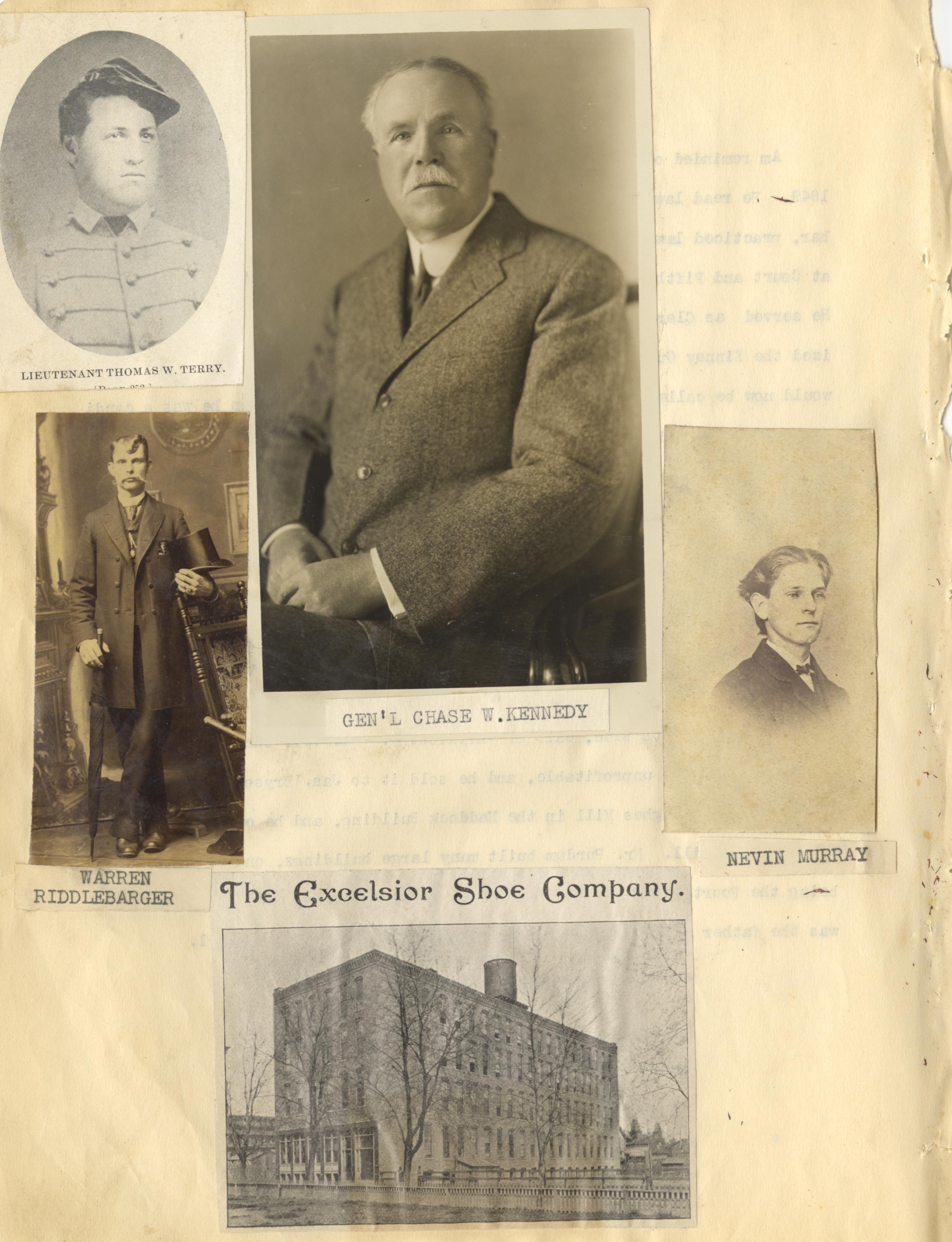 - Photo image of scanned scrapbook page. Lieutenant Thomas W. Terry; Gen'l Chase W. Kennedy; Warren Riddlebarger; Nevin Murray; The Excelsior Shoe Company