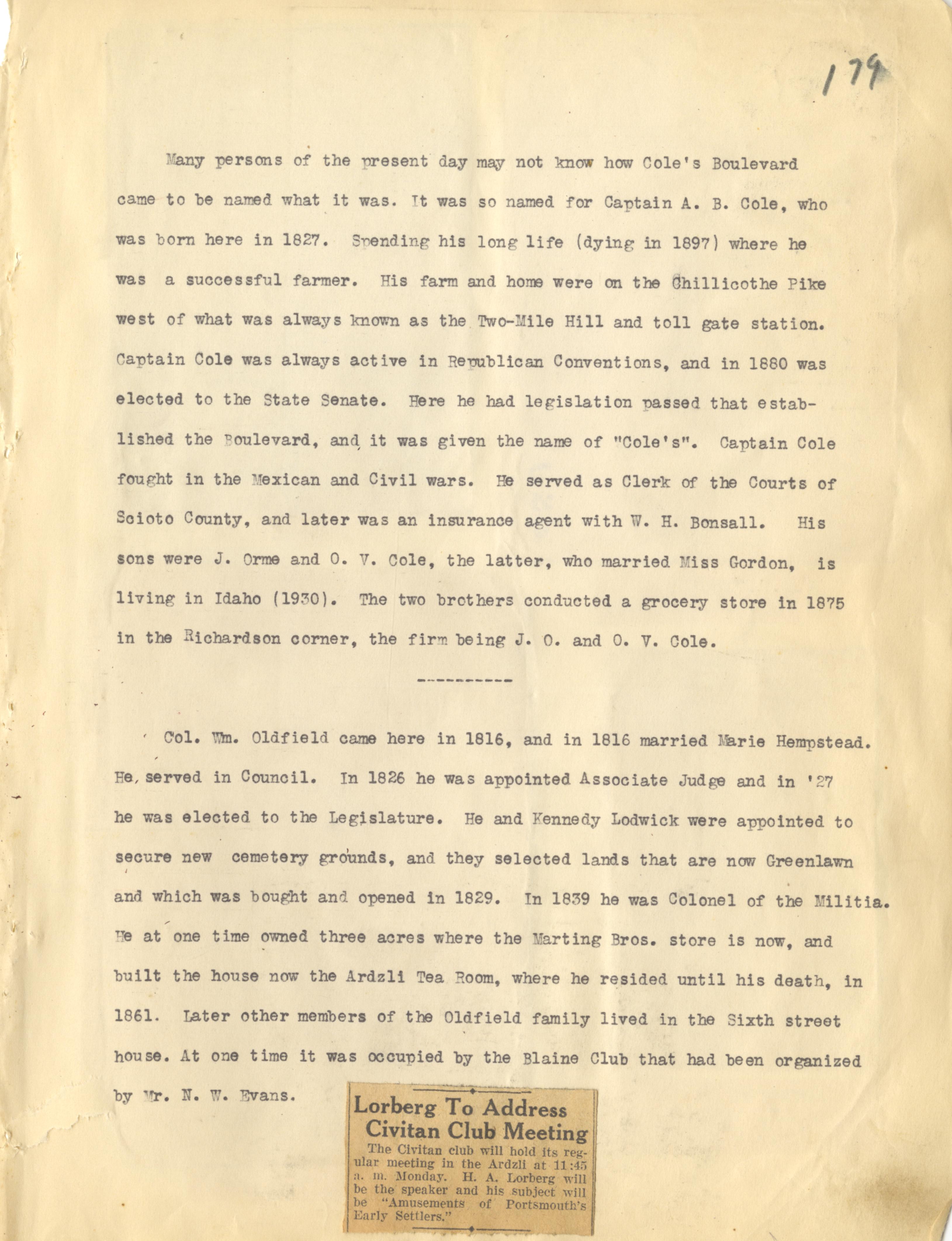 - Photo image of scanned scrapbook page 179. Cole's Boulevard; Captain A.B. Cole (1827); Death (1897); Farmer; Chillicothe Pike; Two-Mile Hill; Republican Conventions; State Senate (1860); Mexican War; Civil War; Clerk of the Courts of Scioto County; W.H. Bonsall; J. Orme; O.V. Cole; Miss Gordon; Grocery Store (1875); Richardson Corner; Col. William Oldfield (1816); Marie Hempstead; Associate Judge (1826); Legislature (1827); Kennedy Lodwick; Greenlawn (1829); Colonel of the Militia (1839); Marting Bros; Ardzli Tea Room; Death (1861); Sixth (6th) Street; Blaine Club; Mr. N.W. Evans