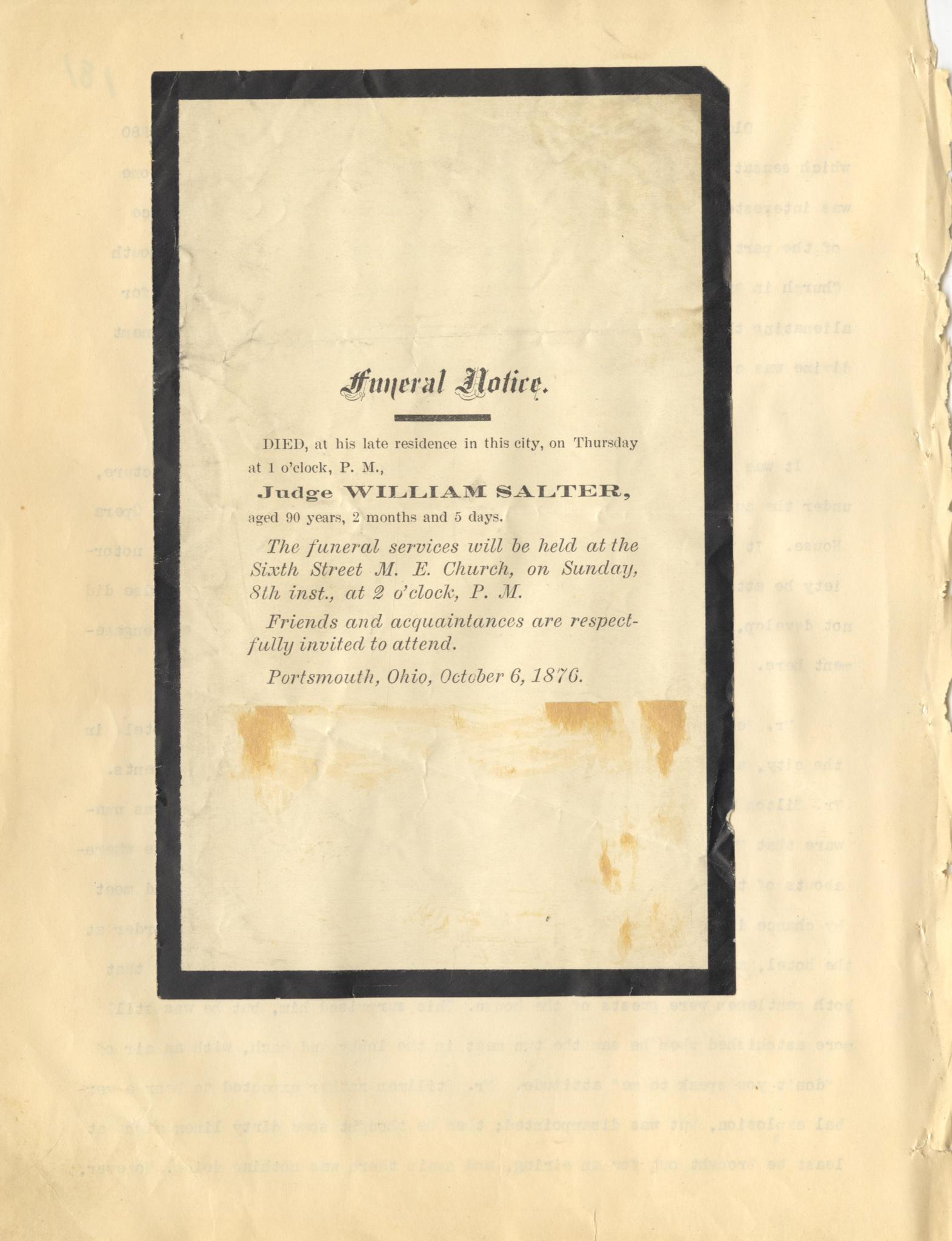 - Photo image of scanned scrapbook page. Funeral Notice; Judge William Salter (1876); Sixth (6th) Street M.E. Church