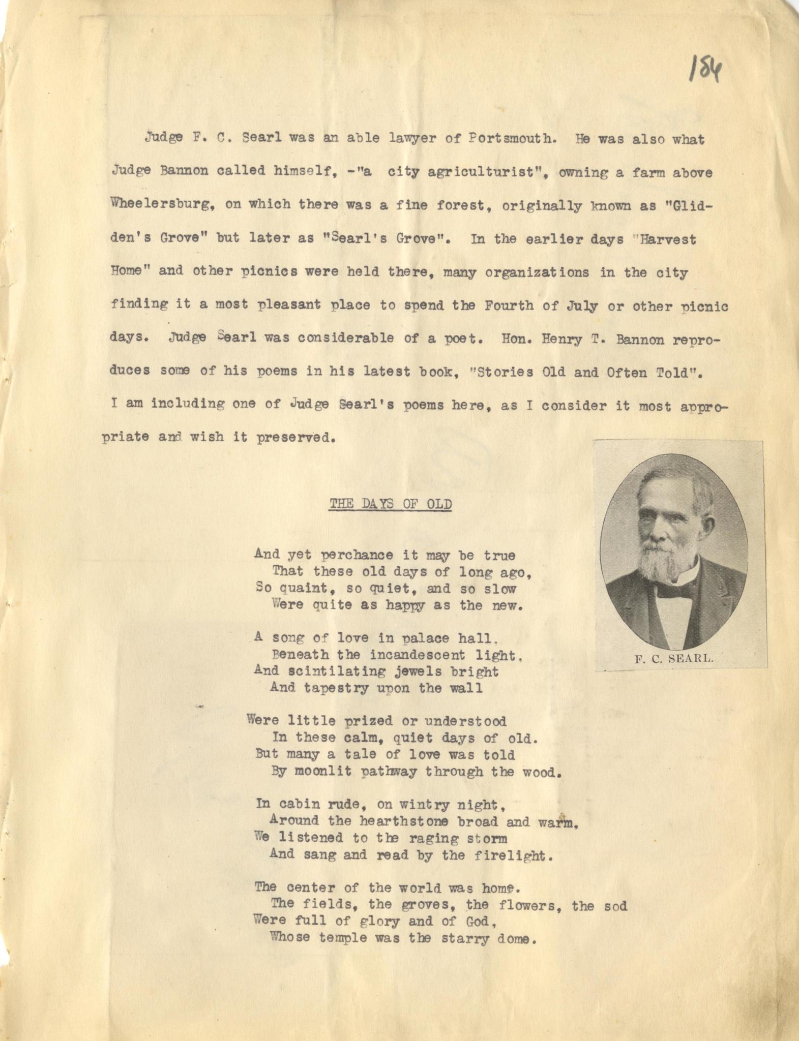 Henry A. Lorberg, “Judge F. C. Searl; Judge Bannon; Glidden's Grove; Searl's Grove; Harvest Home; Judge Searl; Hon. Henry T. Bannon; Stories Old and Often Told; Judge Searl; The Days of Old,” Scioto County Public Library Local History Digital Collection, accessed December 13, 2025, https://www.sciotolibrary.org/history/items/show/24197.