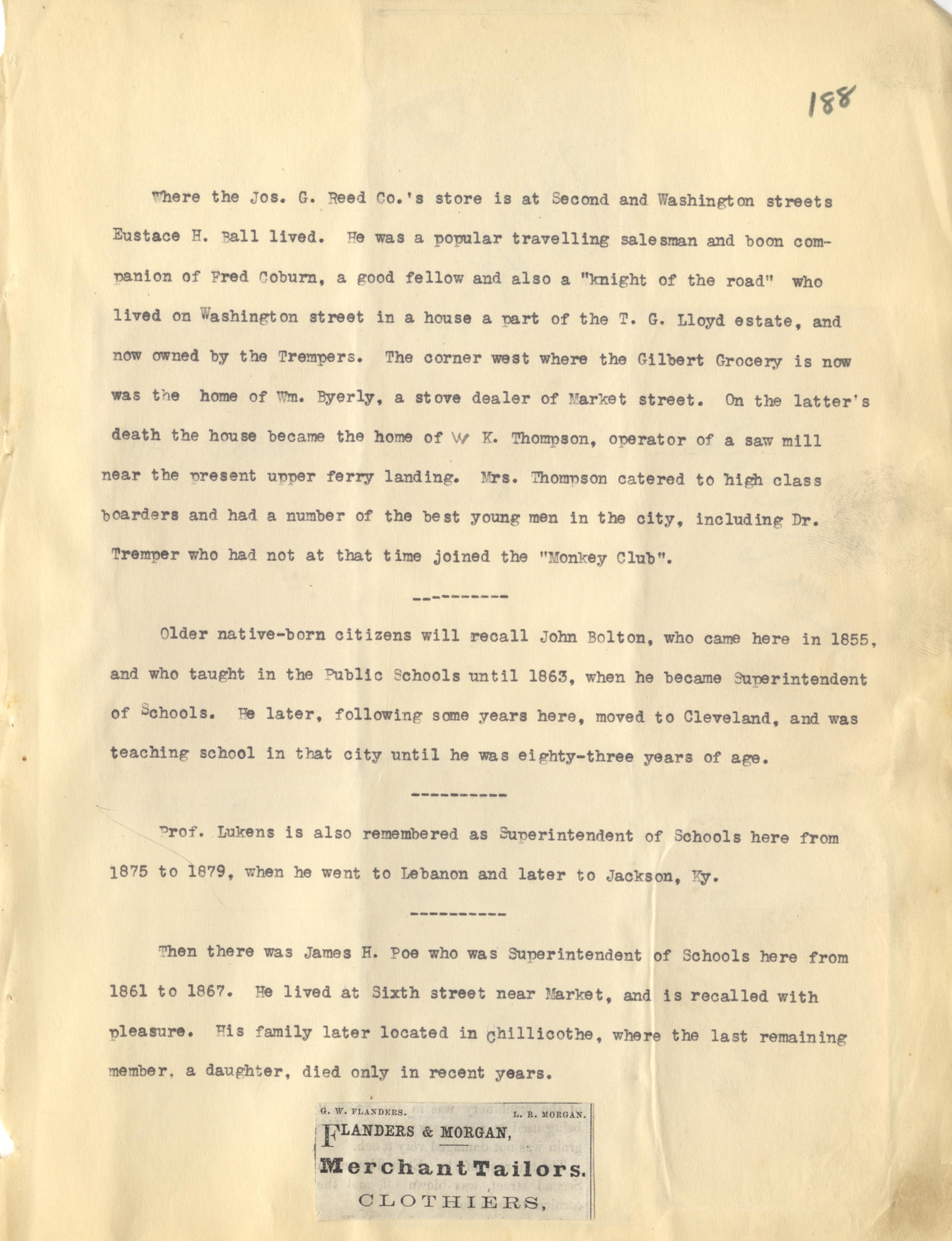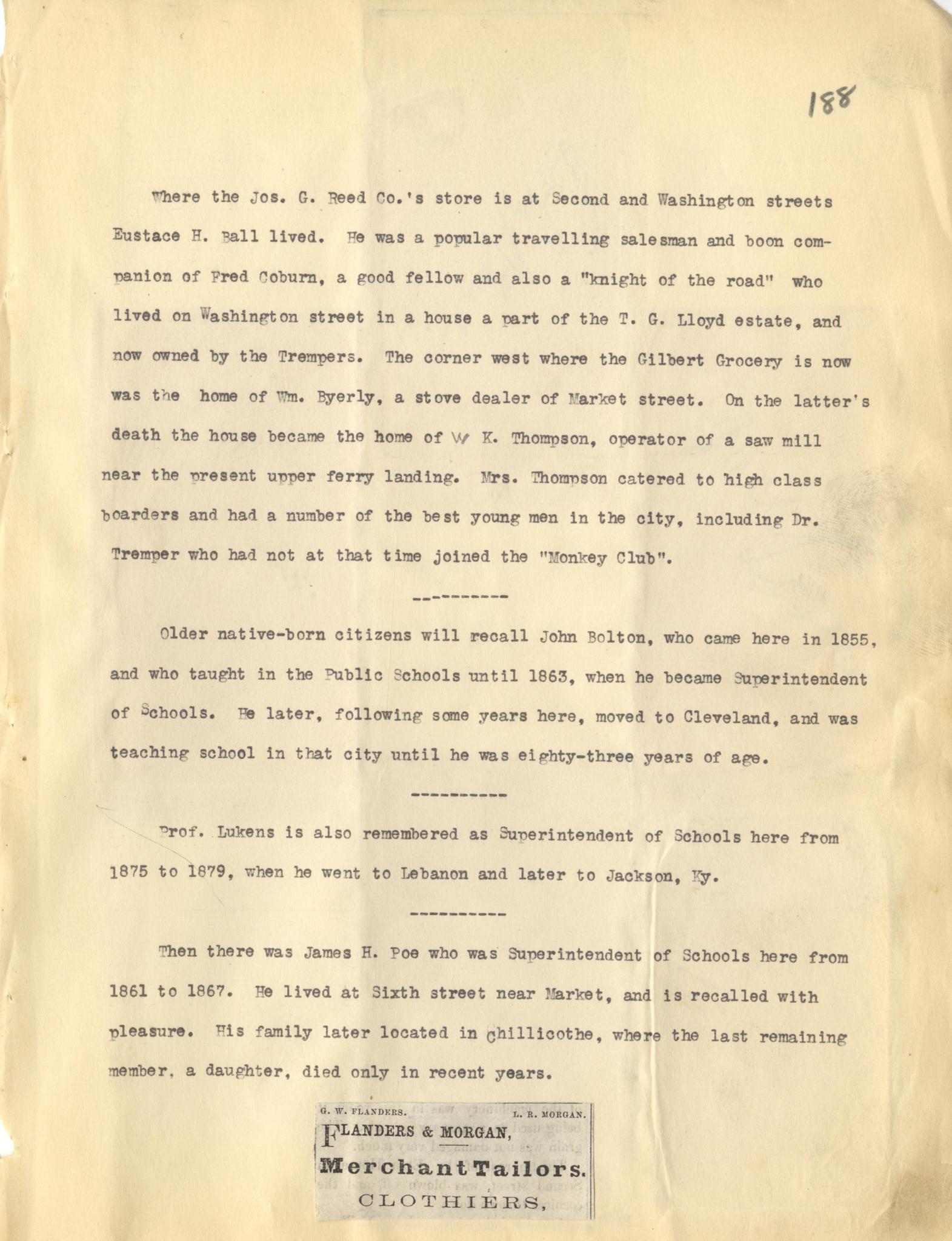Henry A. Lorebrg, “Joseph G. Reed Co; Second (2nd) Street; Washington Street; Eustace H. Ball; Fred Coburn; T. G. Lloyd; The Trempers; Gilbert Grocery; William Byerly; Market Street; W. K. Thompson; Saw Mill; Mrs. Thompson; Monkey Club; Dr. Tremper; John Bolton (1855; Public Schools (1863); Prof. Lukens; Superintendent (1875-1879); James H. Poe (1861-1867); Sixth (6th) Street,” Scioto County Public Library Local History Digital Collection, accessed December 15, 2025, https://www.sciotolibrary.org/history/items/show/24201.