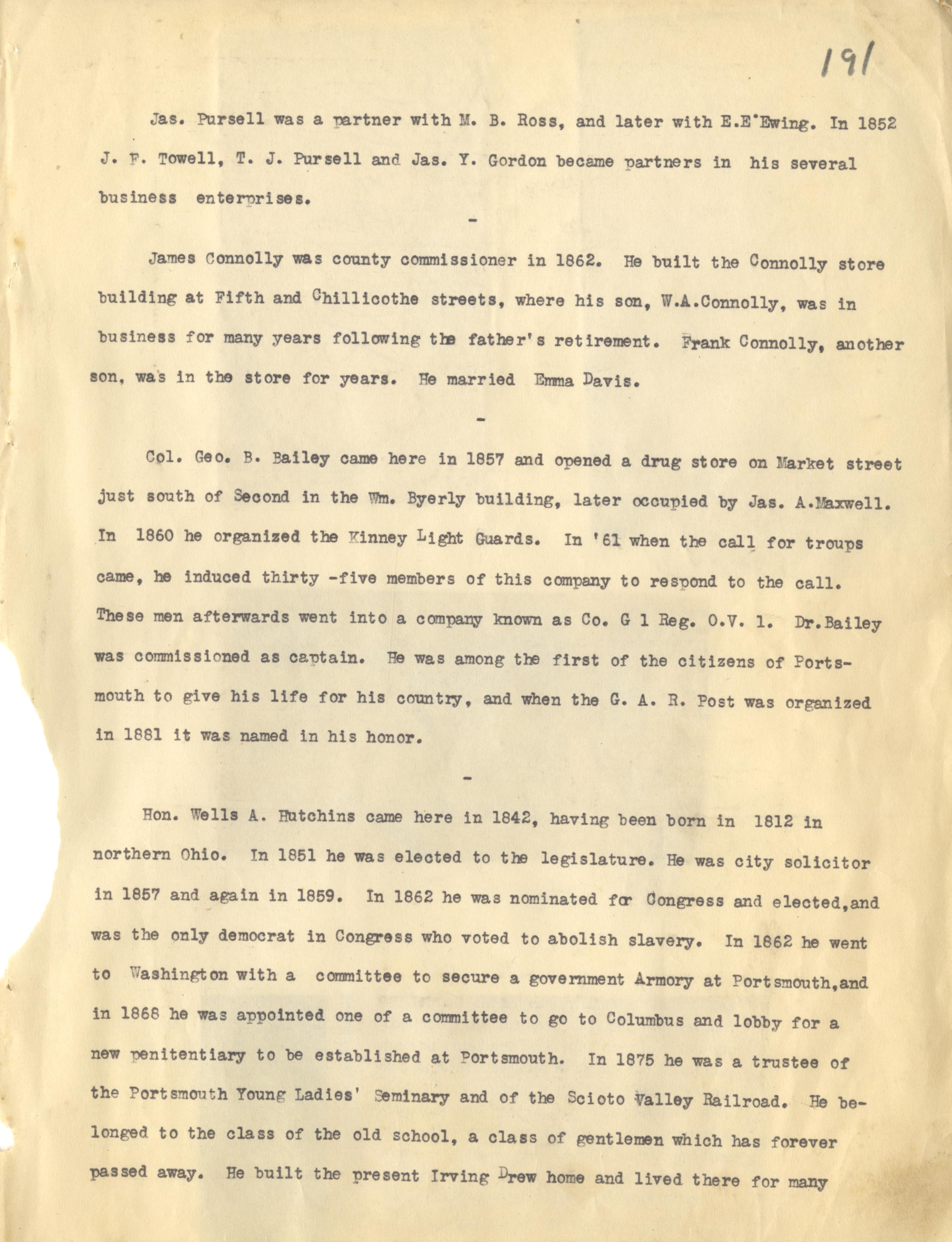 - Photo image of scanned scrapbook page 191. James Pursell; M.B. Ross; E.E. Ewing; J.F. Towell (1852); T.J. Pursell; James Y. Gordon; James Connolly; County Commissioner (1862); Connolly Store; Fifth (5th) Street; Chillicothe Street; W.A. Connolly; Frank Connolly; Emma Davis; Col. George B. Bailey (1857); Market Street; William Byerly Building; James A. Maxwell; Kinney Light Guards (1860); Call for Troops (1861); Co. G 1 Reg O.V.I.; Dr. Bailey; G.A.R. Post (1881); Hon. Wells A. Hutchins (1842); Born (1812); City Solicitor (1857, 1859); Congress (1862); Armory (1868); Penitentiary (1868); Portsmouth Young Ladies' Seminary (1875); Scioto Valley Railroad; Irving Drew Home