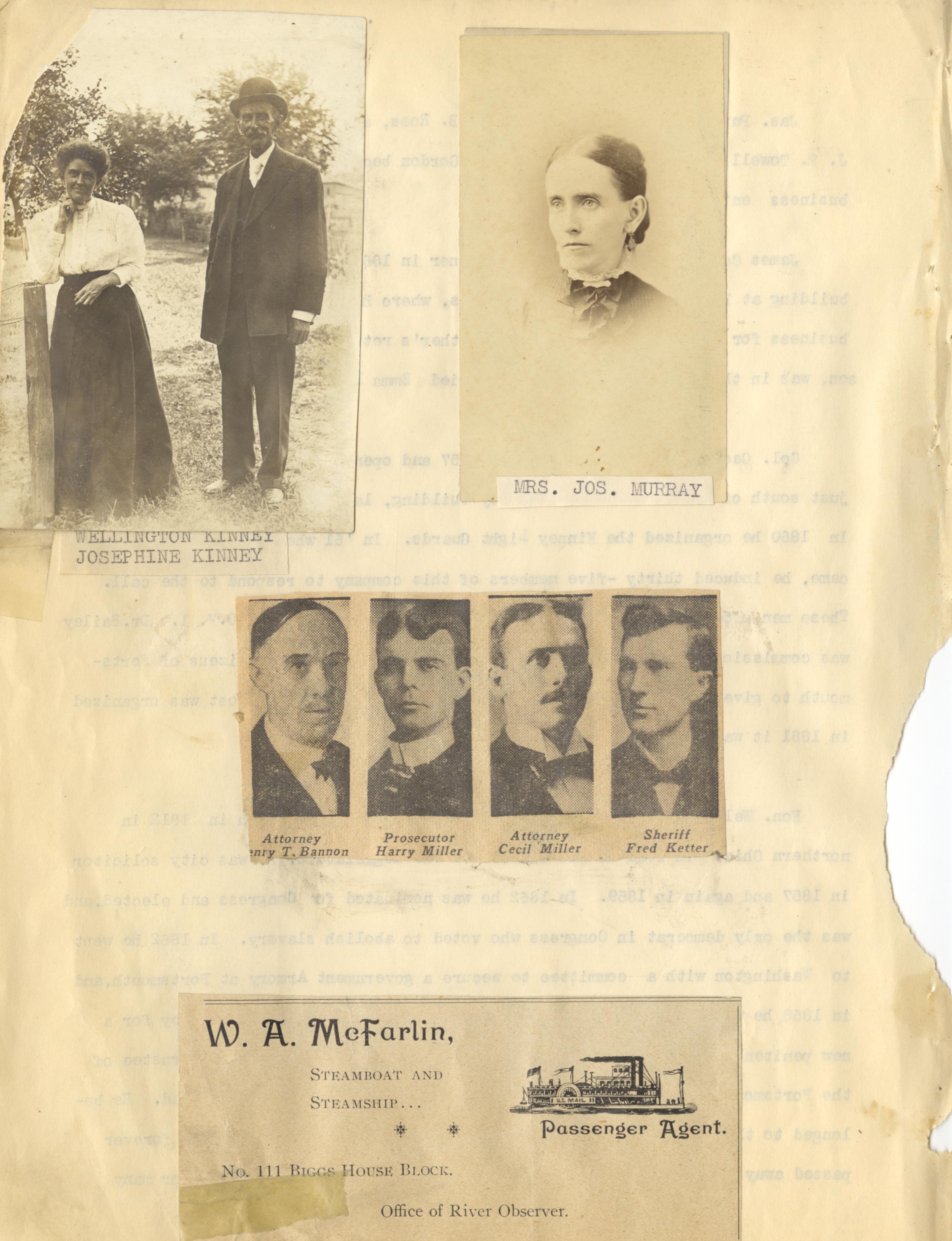 - Photo image of scanned scrapbook page. Wellington Kinney; Josephine Kinney; Mrs. Joseph Murray; Henry T. Bannon; Harry Miller; Cecil Miller Fred Ketter; W.A. McFarlin; Biggs House Block