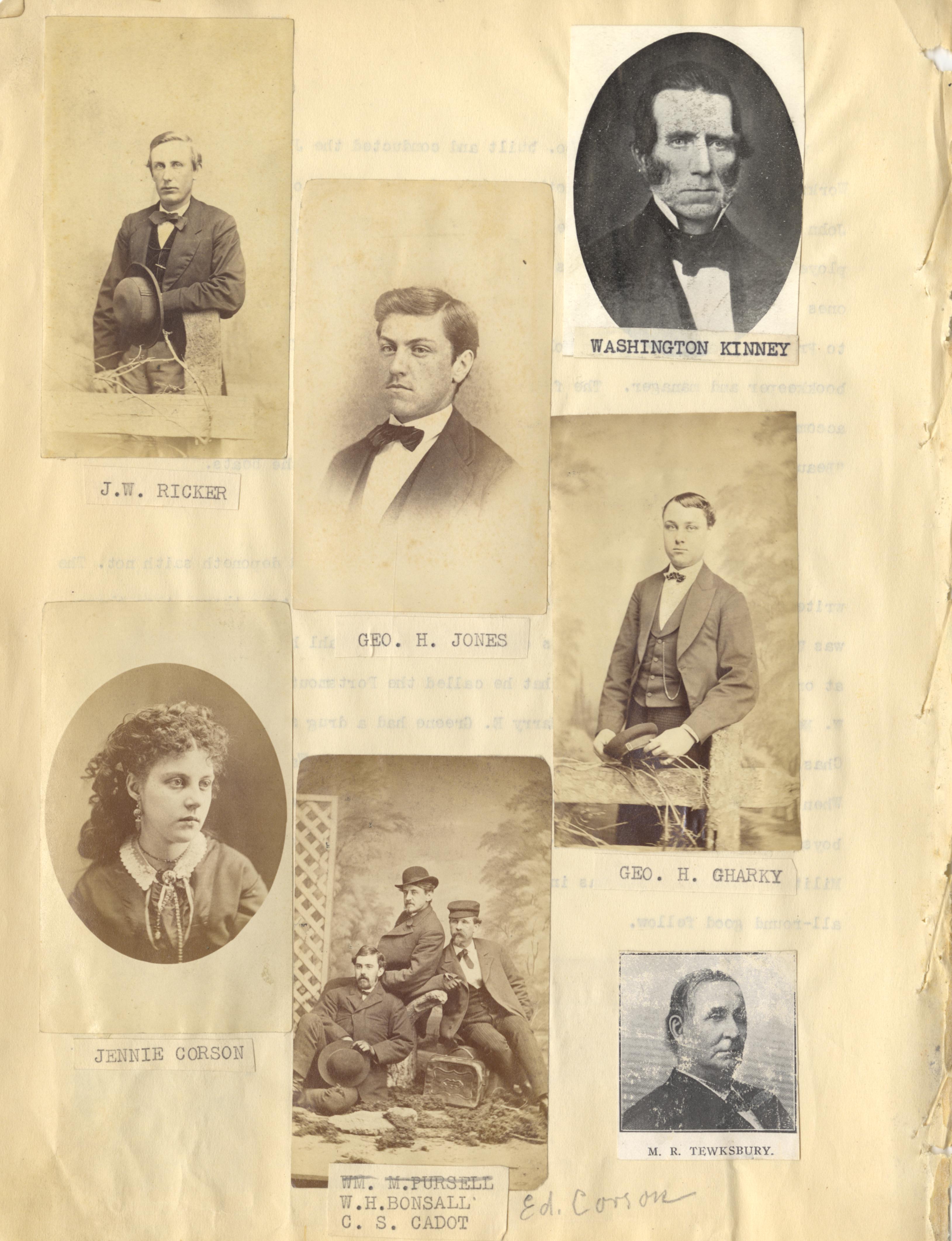 - Photo image of scanned scrapbook page. J.W. Ricker; Washington Kinney; George H. Jones; George H. Gharky; Jennie Corson; Edward Corson; W.H. Bonsall; C.S. Cadot; M.R. Tewksbury
