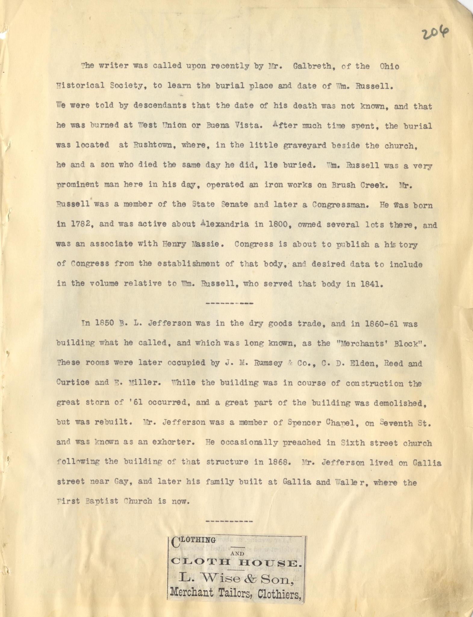 - Photo image of scanned scrapbook page 206. Mr. Galbreth; Ohio Historical Society; William Russell; West Union; Buena Vista; Rushtown; Brush Creek; State Senate; Congressman; Born (1782); Alexandria (1800); Henry Massie; B.L. Jefferson (1850); Merchant's Block (1860-1861); J. M. Rumsey & Co; C.D. Elden; Reed and Curtice; E. Miller; Great Storm (1861); Spencer Chapel; Seventh (7th) Street; Sixth (6th) Street Church (1868); Gallia Street; Waller Street; First Baptist Church; Clothing; L. Wise & Son