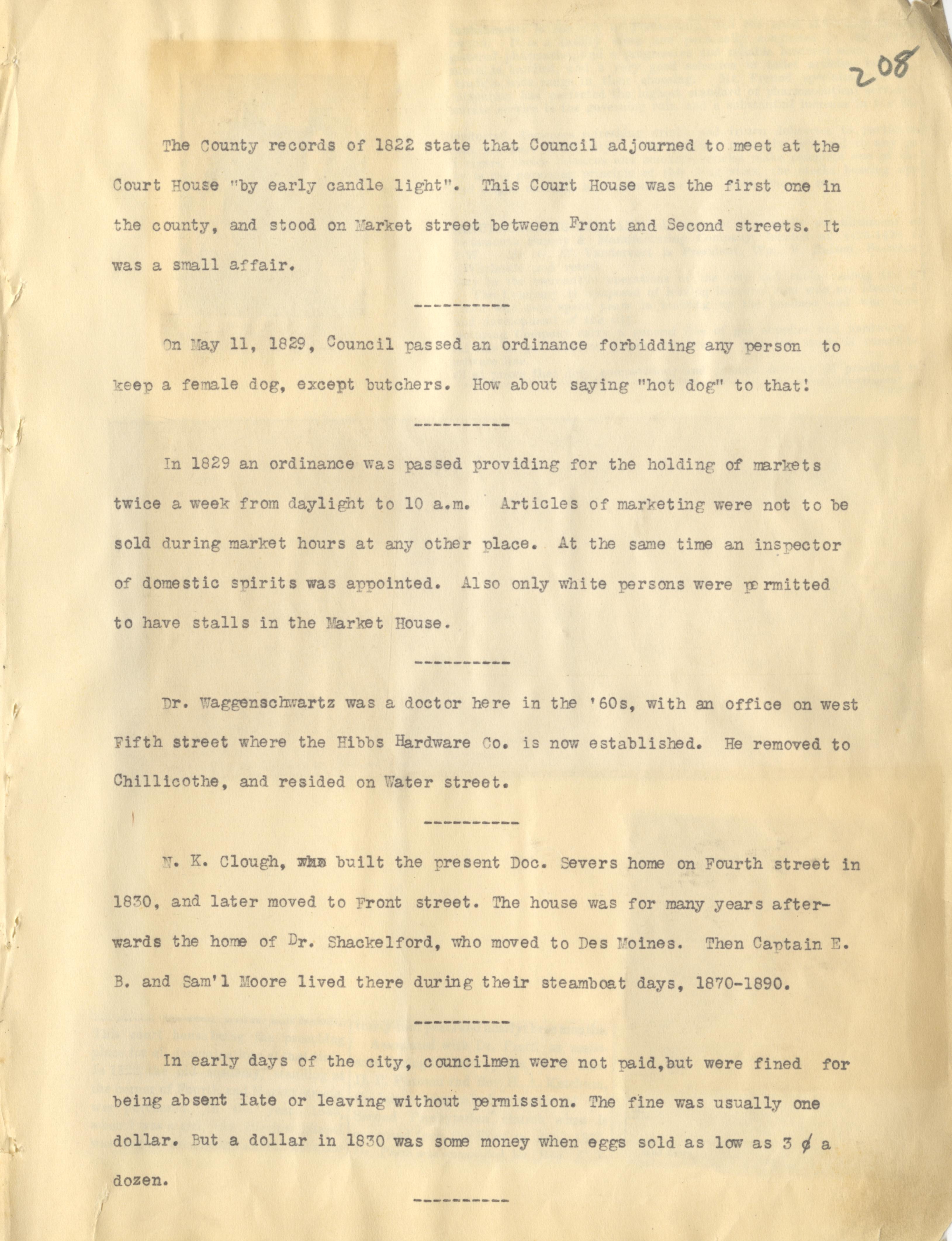 - Photo image of scanned scrapbook page 208.The County Records (1822); Council; Court House; Market Street; Front Street; Second (2nd) Street; Ordinance; Female Dog (1829); Articles of Marketing (1829); Dr. Waggenschwartz (1860s); Fifth (5th) Street; Water Street; N.K. Clough; Fourth (4th) Street (1830); Dr. Shackelford; Des Moines; Captain E.B.; Sam'l Moore; Steamboat (1870-1890); Councilmen