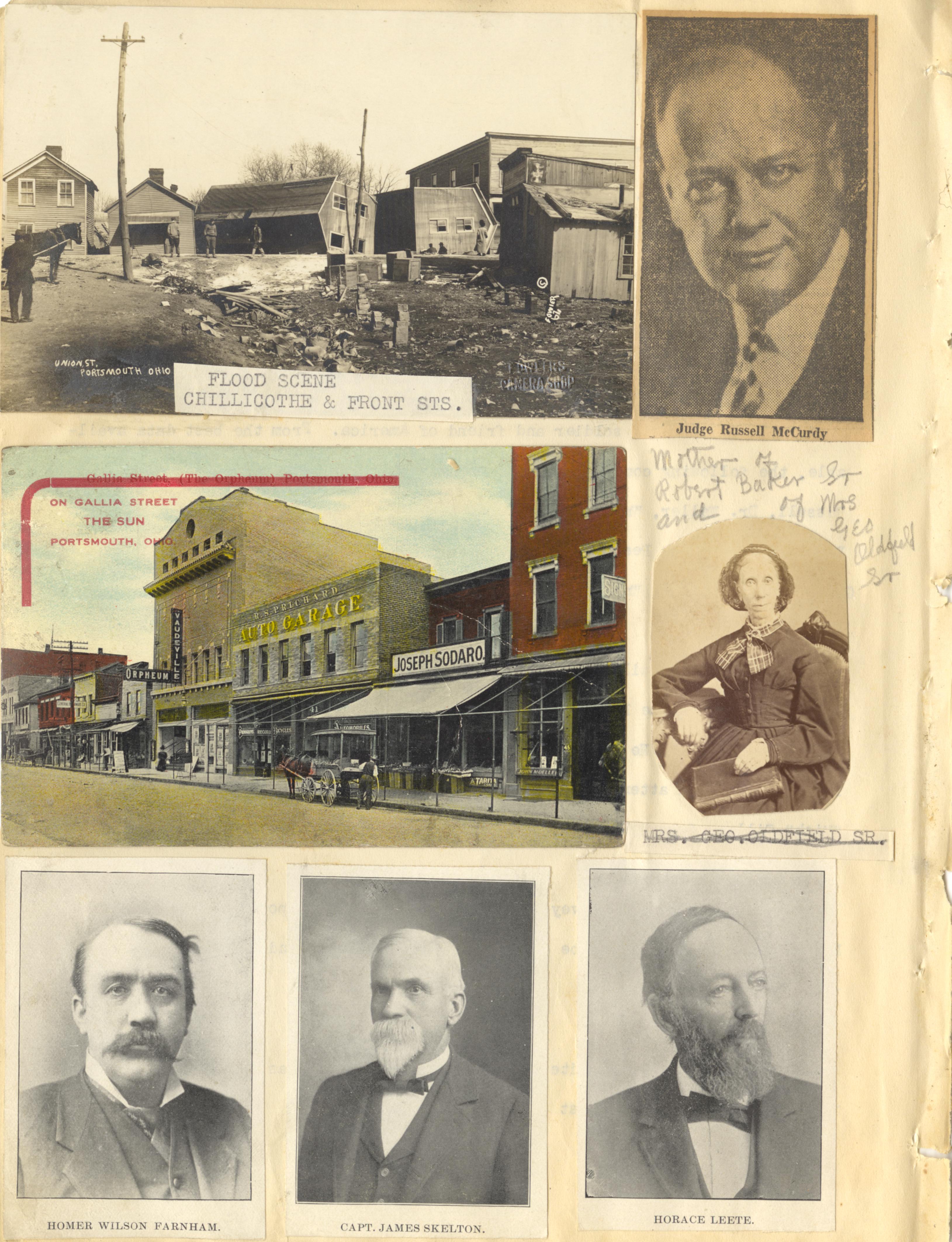 - Postcards of Flood Scene Chillicothe & Front Streets; The Sun Theatre: Newspaper photo of Judge Russell McCurdy; Sepia tone photo image of Mother of Robert Baker Sr & Mrs. George Oldfield Sr; Black & white photo images of Homer Wilson Farnham; Capt. James Skeleton; Horace Leete from Lorberg's Portsmouth Pictorial and mounted in scrapbook.