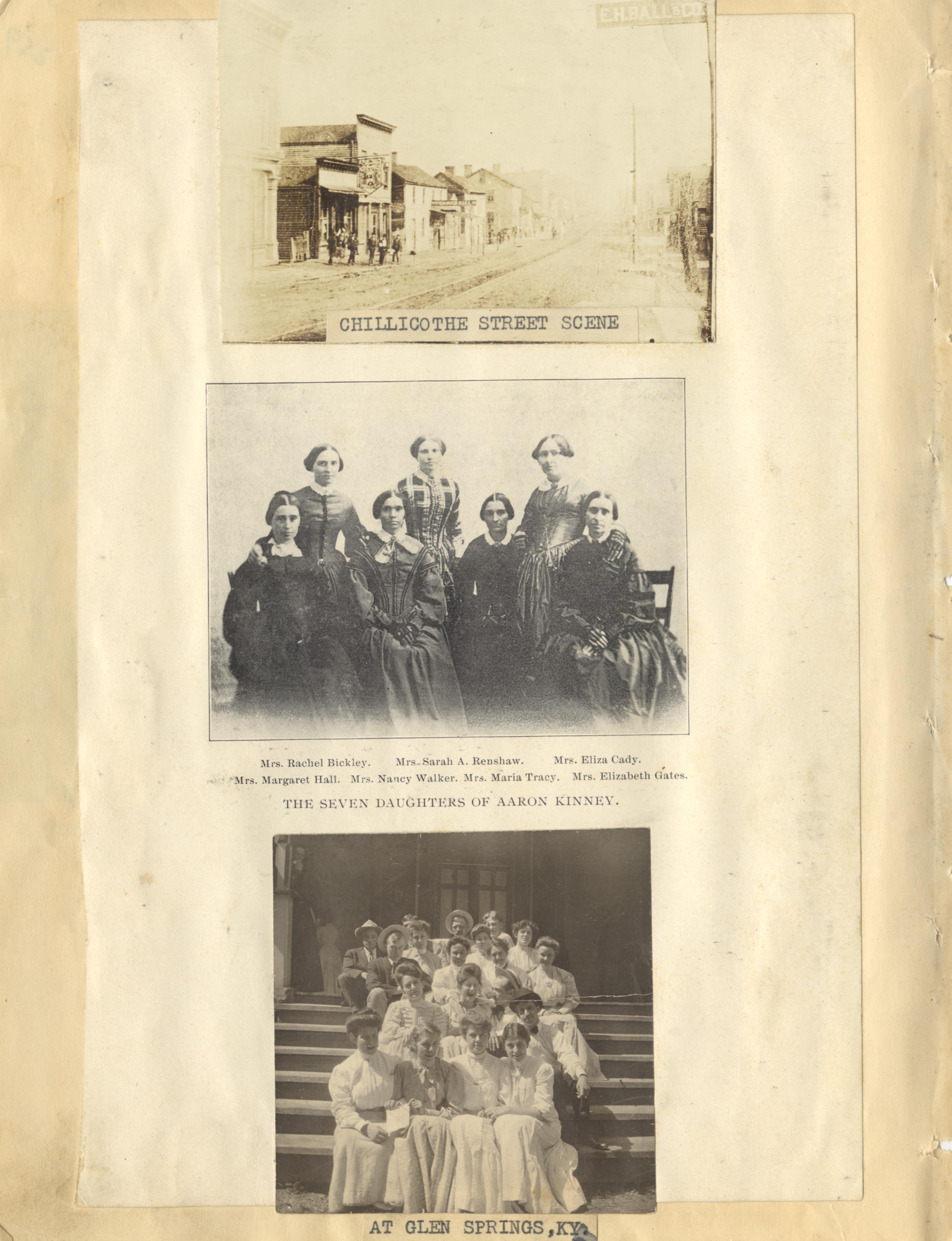 - Scanned scrapbook page. At top is a photo of early businesses along an unpaved Chillicothe Street. In the center photo the seven daughters of Aaron Kinney are named: Mrs. Rachel Bickley, Mrs. Margaret Hall, Mrs. Sarah A. Renshaw, Mrs. Nancy Walker, Mrs. Maria Tracy, Mrs. Eliza Cady, and Mrs. Elizabeth Gates. The lower photo shows about 19 happy young people seated on steps during an outing to Glen Springs, Kentucky.